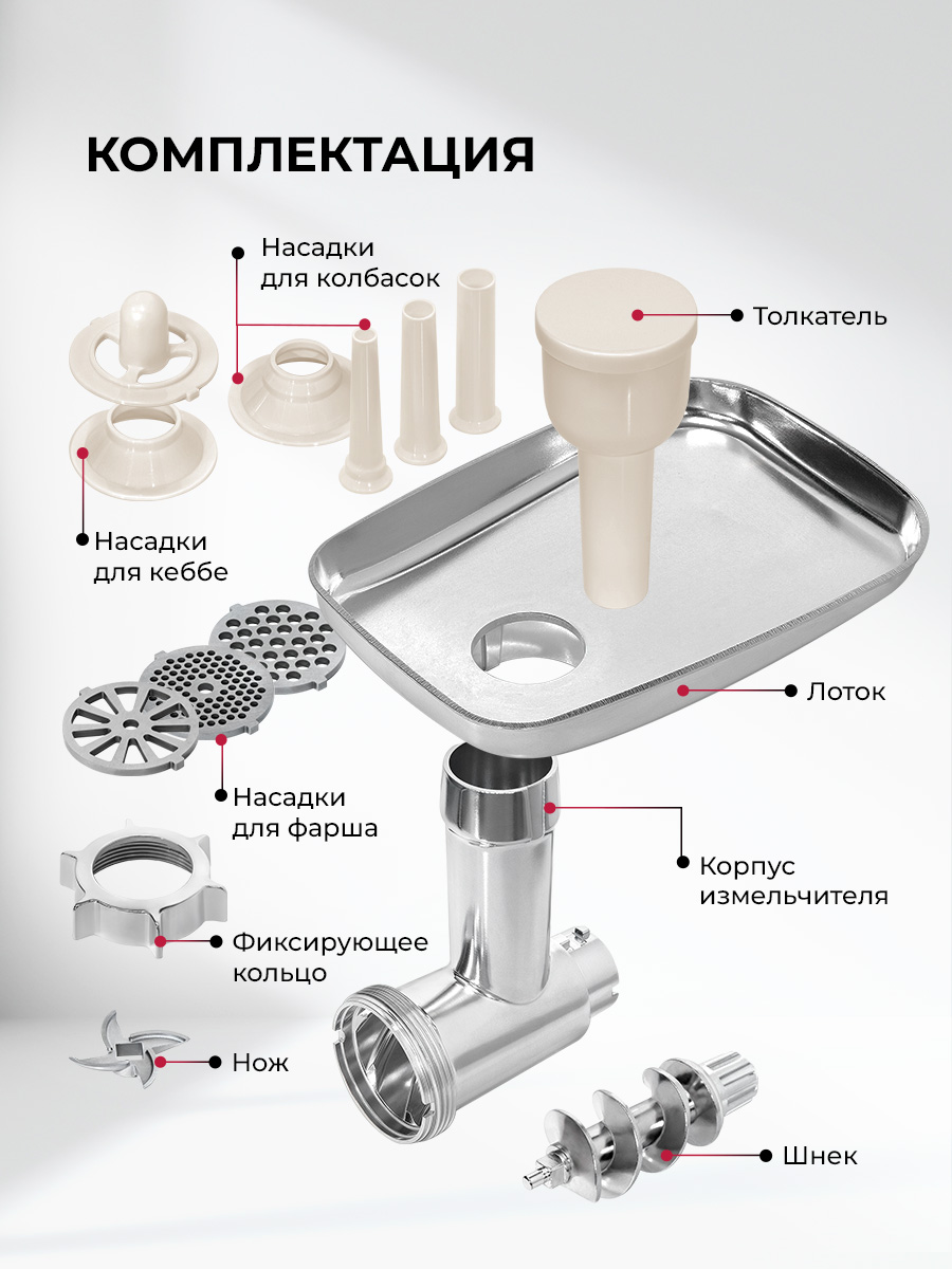 Диск для крупного помола, Диск для мелкого помола, Диск для среднего помола, Насадка для кеббе, Насадки для колбасок, Нож