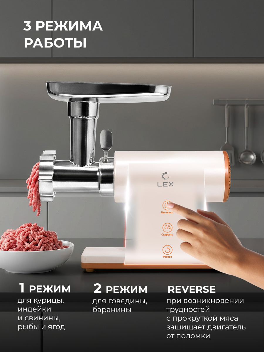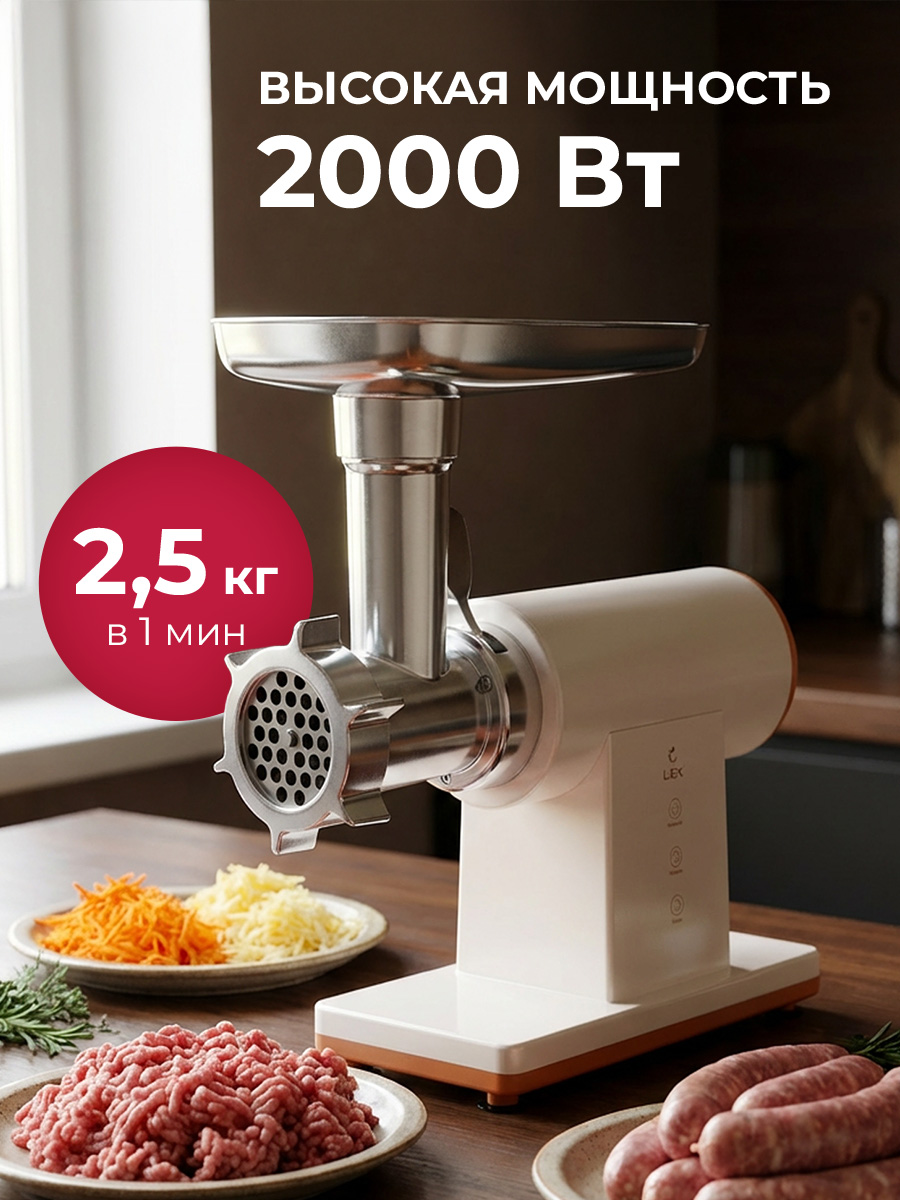 Мясорубка LEX LX 4002/LX 4003 оснащена надёжным медным двигателем номинальной мощностью 2000 Вт при пиковой нагрузке. Двигатель обеспечивает устойчивую работу при переработке различных видов продуктов, включая мясо с прожилками и овощи. Производительность достигает 2,5 кг в минуту — этого достаточно, чтобы быстро приготовить фарш для котлет, фрикаделек, пельменей или начинок для домашней выпечки. Увеличенный крутящий момент мотора позволяет эффективно работать даже при значительных объёмах без снижения скорости вращения шнека.