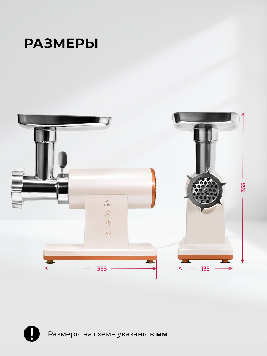 Корпус мясорубки эргономичен и не занимает много места на кухне. Габариты устройства составляют 355 × 135 × 355 мм, что позволяет хранить его даже в небольших шкафах или на открытых полках. Длина кабеля 100 см даёт свободу в выборе места установки. Уровень шума не превышает 75 дБ — прибор работает достаточно тихо для бытового использования. Благодаря продуманной конструкции сборка и разборка выполняются быстро, а комплектующие легко моются вручную.