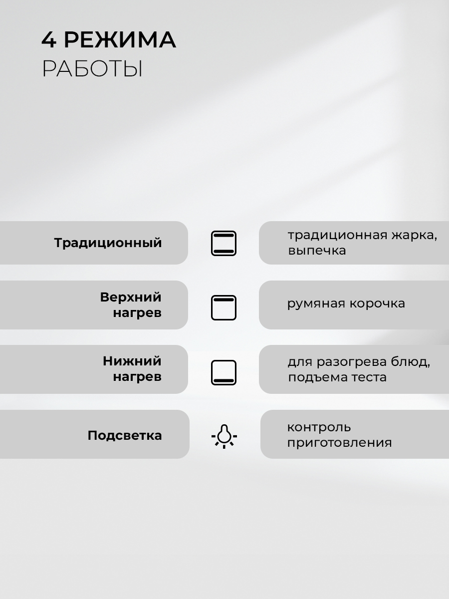Традиционный, верхний нагрев, нижний нагрев, подсветка