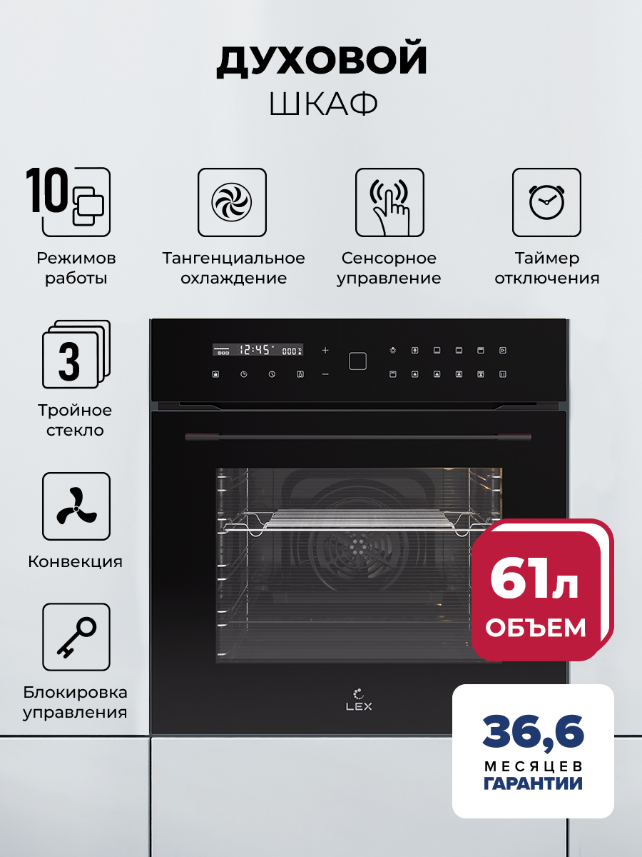 Электрический духовой шкаф EDS 101 — одна из самых продвинутых моделей в ассортименте LEX. Устройство может работать в 10 режимах, оснащено усиленным грилем, функцией конвекции, кольцевым нагревательным элементом для идеального пропекания любимых блюд даже на нескольких уровнях рабочей камеры. Современная сенсорная панель управления с дисплеем делает управление духовым шкафом максимально понятным и удобным, а отсутствие механических переключателей облегчает чистку. Благодаря встроенному таймеру вам не придется беспокоиться, что продукты пригорят или не дойдут до готовности, а блокировка управления поможет избежать случайной смены настроек и обеспечит безопасность во время приготовления.