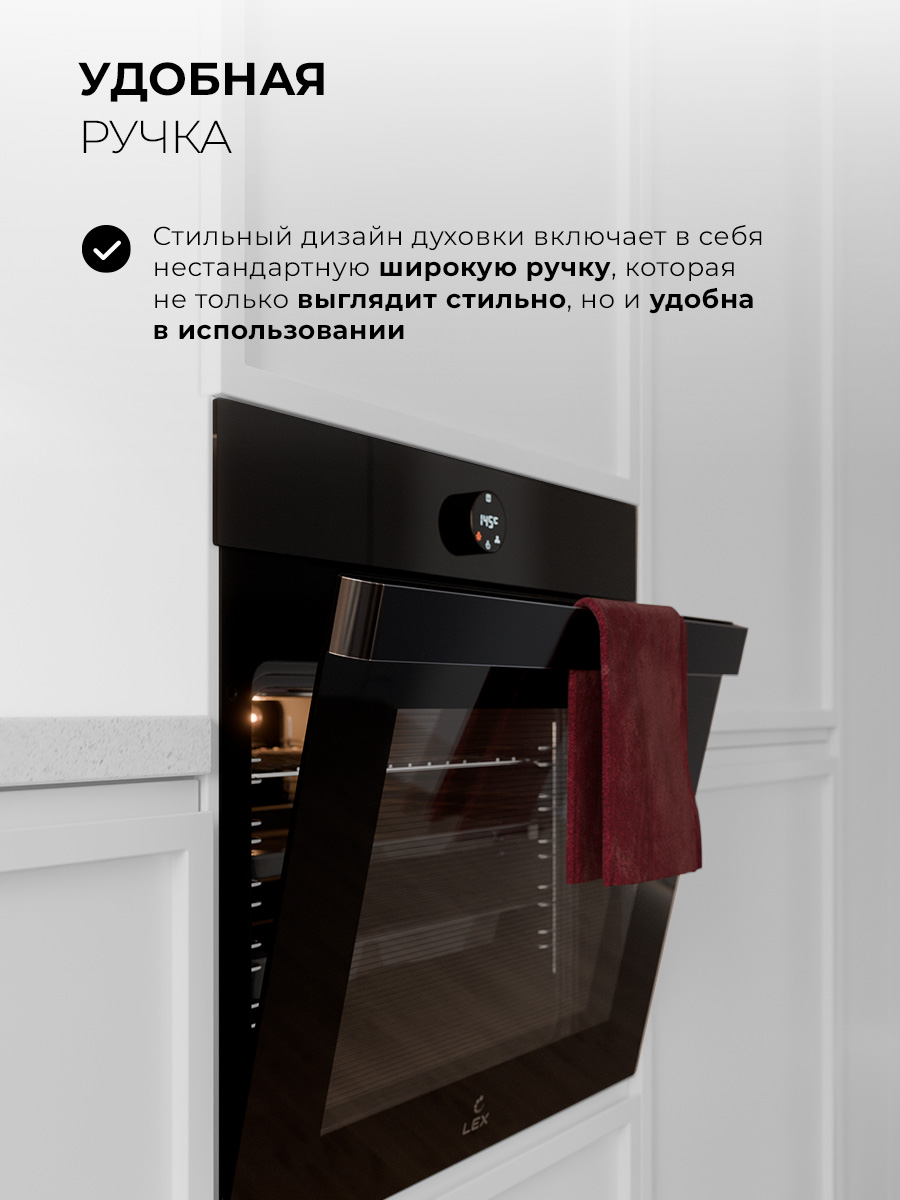 Духовой шкаф LEX EDP 607 Wide Series — комфорт и надежность в одном устройстве Эта модель предлагает просторную камеру объемом 72 литров, 7 режимов приготовления, идеально подходящую для приготовления больших блюд и семейных ужинов. Эргономичная широкая ручка и кольцо управления с экраном подчеркивают современный дизайн и удобство использования.