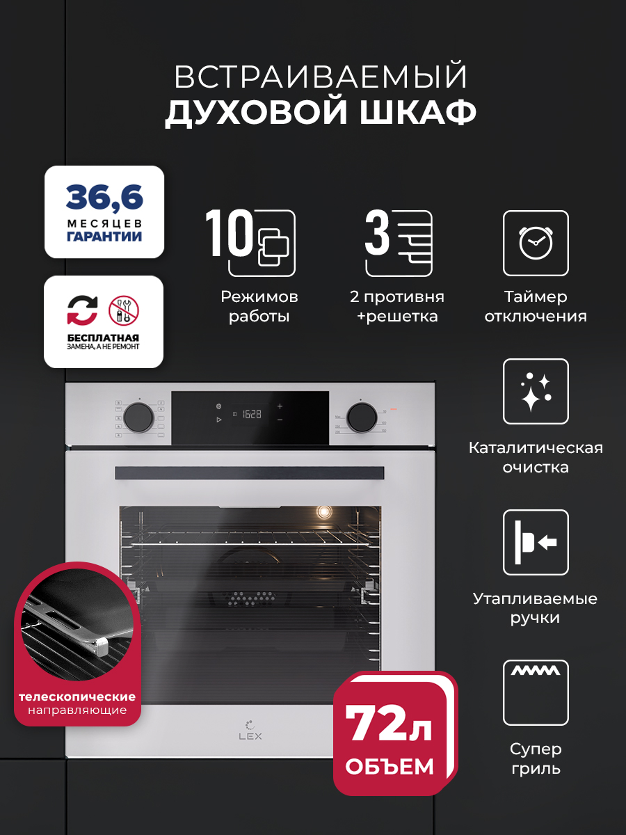 Хромированные телескопические направляющие — удобство и безопасность в использовании Духовой шкаф LEX EDP 610 оснащен хромированными телескопическими направляющими, которые обеспечивают легкий доступ к блюдам во время готовки. Они позволяют безопасно и удобно извлекать противни, снижая риск ожогов и облегчая процесс приготовления.