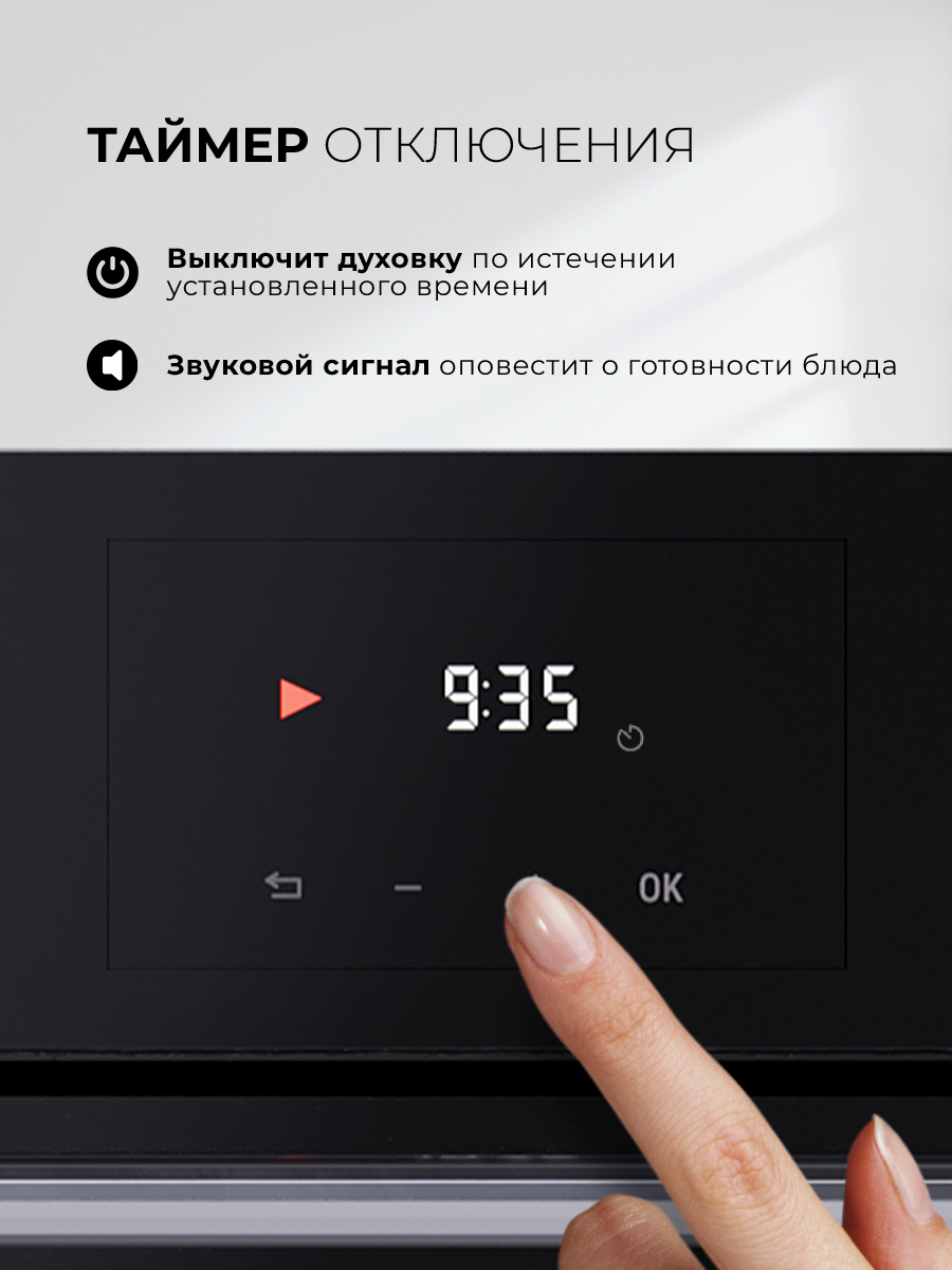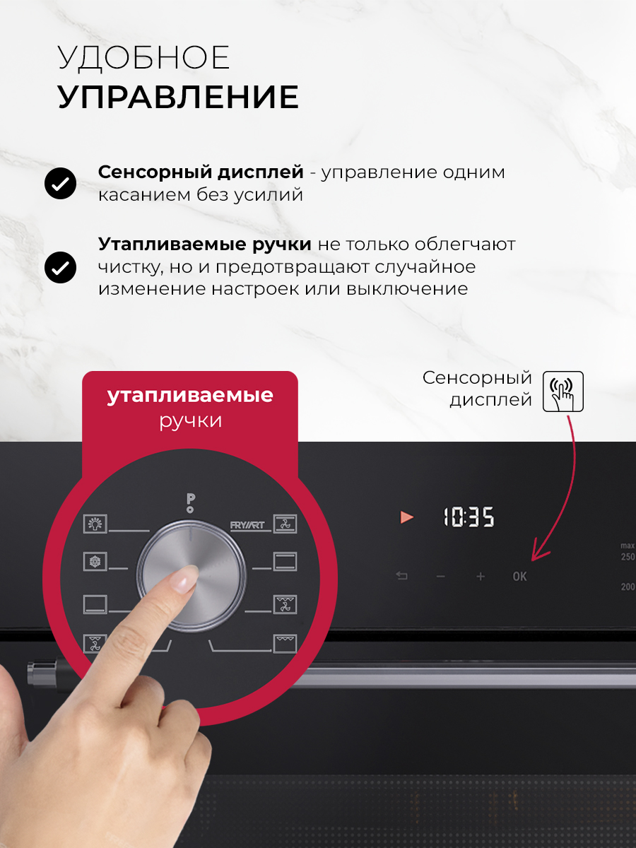 Управление здесь совмещает в себе сенсорные и механические элементы, что позволяет гибко настраивать параметры готовки. Удобный LED-дисплей отображает все важные данные, а утапливаемые ручки добавляют простоты в эксплуатации и поддержании чистоты.