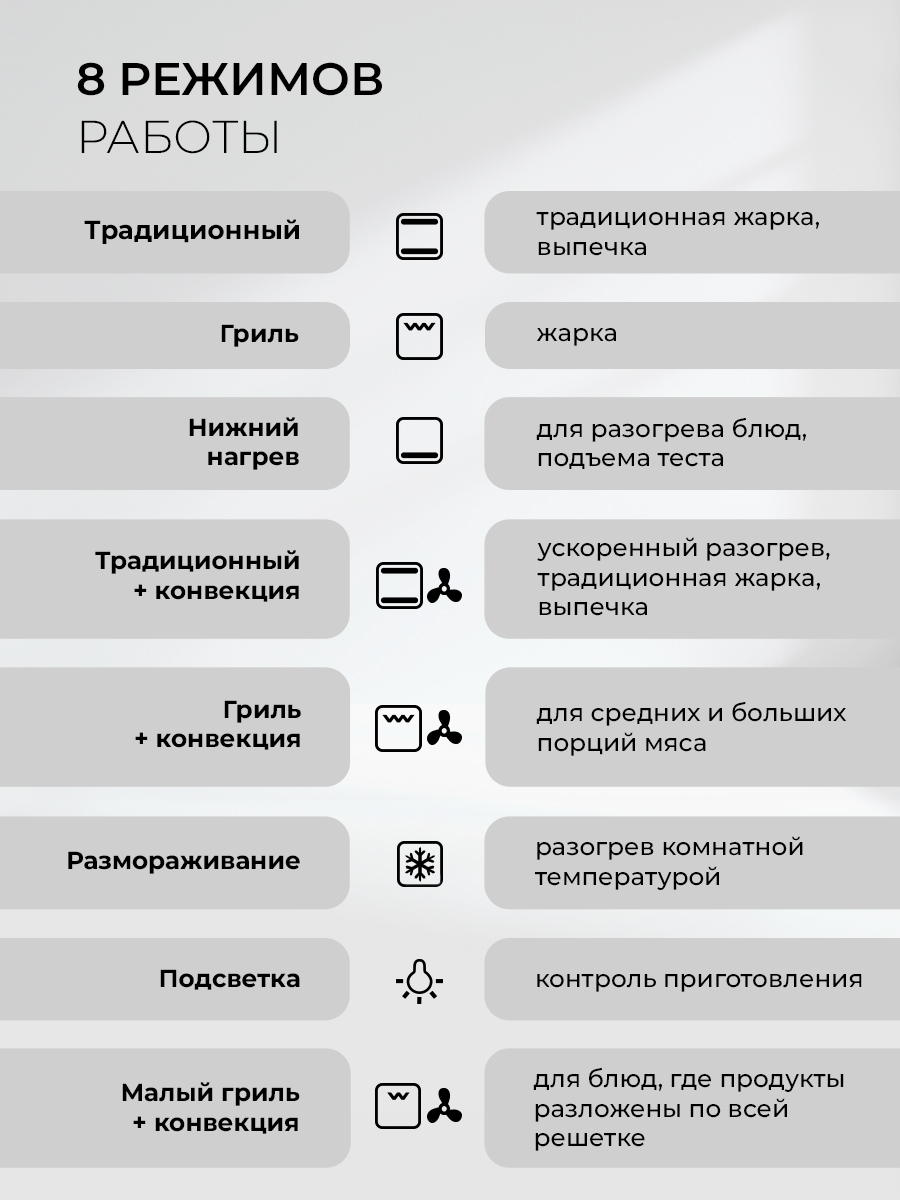 Гриль, Гриль с конвекцией, Нижний нагрев, Подсветка, Размораживание, Традиционный, Малый гриль с конвекцией, Традиционный нагрев с конвекцией FryArt