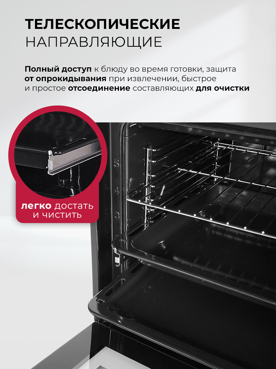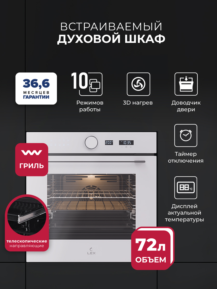 Благодаря 10 режимам работы, включая гриль с конвекцией, режим пиццы и размораживание, вы сможете готовить блюда любой сложности. Просторная камера объемом 72 литра обеспечивает место для больших порций, а телескопические направляющие и плавное закрытие дверцы делают использование максимально комфортным.