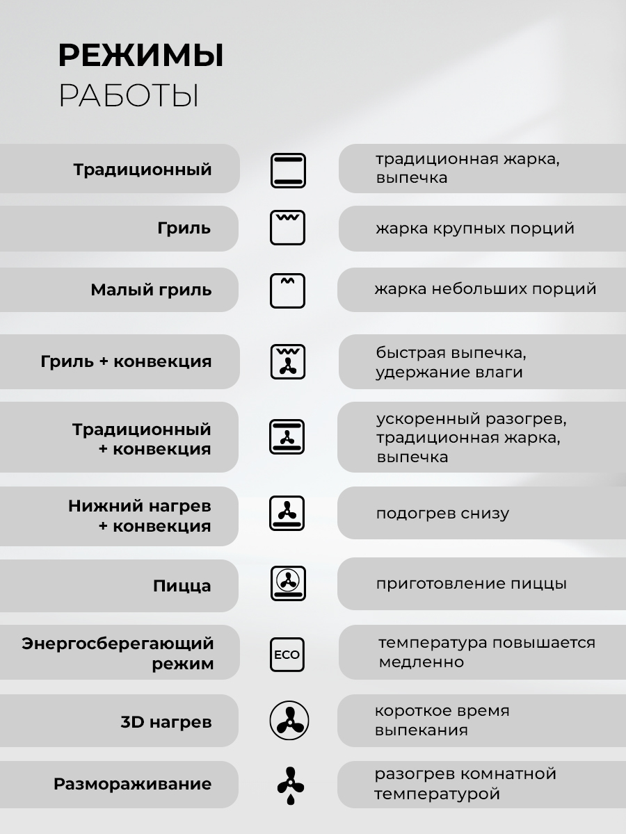3D конвекция, Гриль с конвекцией, Нижний нагрев с конвекцией, Размораживание, Традиционный, Малый гриль, Пицца, Полный гриль, Традиционный нагрев + конвекция, Энергосберегающий режим