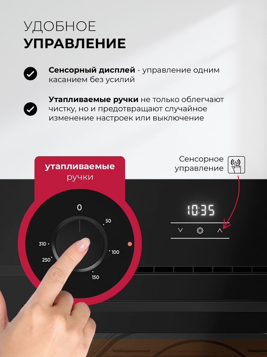 Комбинированное управление объединяет сенсорную панель с дисплеем и механические утапливаемые ручки. Предусмотрена блокировка сенсорного управления, что особенно актуально в домах с детьми.
