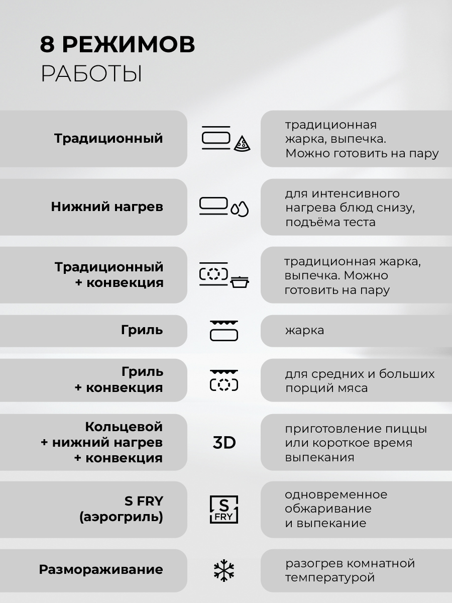 3D конвекция, Гриль, Гриль с конвекцией, Нижний нагрев, Размораживание, Традиционный, S FRY(Аэрогриль), Традиционный нагрев + конвекция