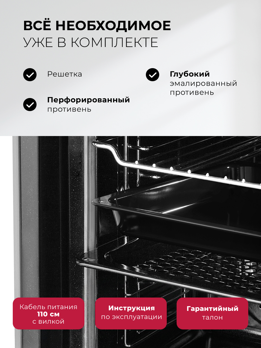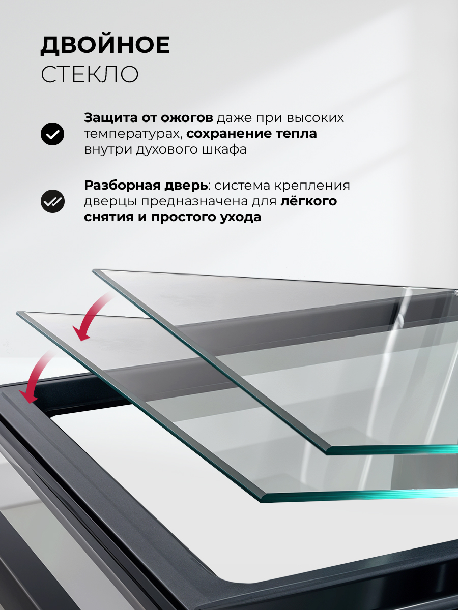 Фасад выполнен из закаленного стекла, устойчивого к нагреву и повседневной эксплуатации. Подсветка камеры позволяет контролировать процесс приготовления без открытия дверцы.