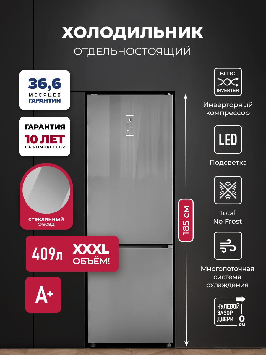 Холодильник LEX LKB185 оснащен современным инверторным компрессором, который гарантирует эффективную и практически бесшумную работу. Он также обеспечивает низкий расход энергии и долго поддерживает температуру без электропитания. Технология Total No Frost значительно упрощает обслуживание и помогает устанавливать оптимальную температуру и влажность.