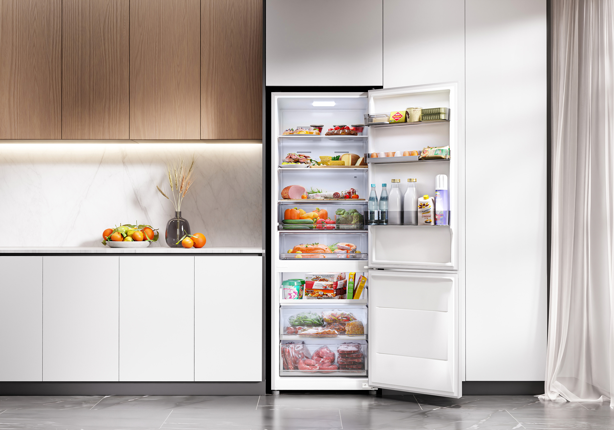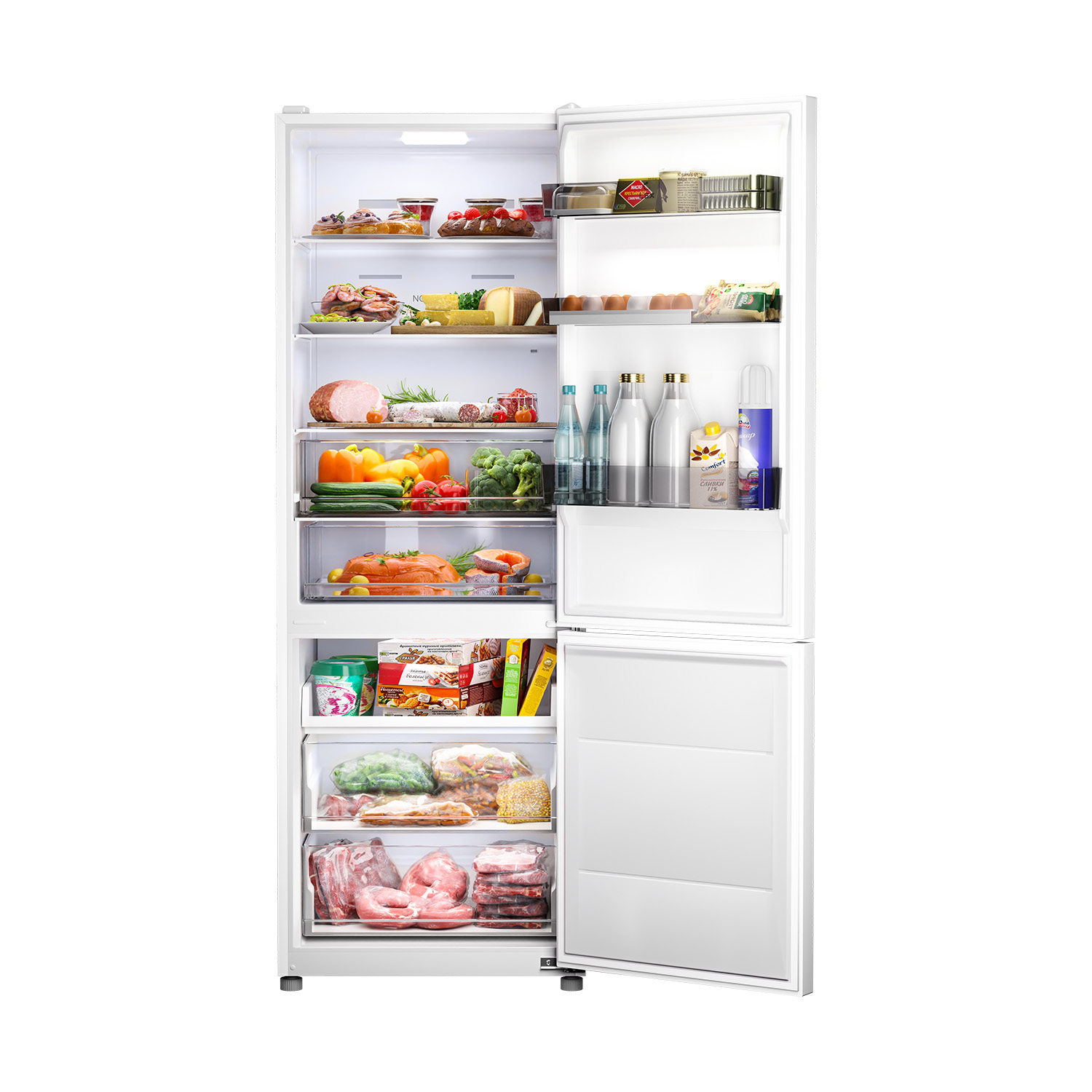 Два отделения с полезным объемом 409 литров дают возможность хранить все блюда и напитки на удобном уровне. Внутреннее пространство холодильника организовано максимально эффективно благодаря регулируемым полкам.