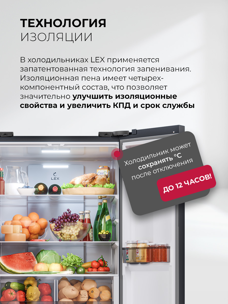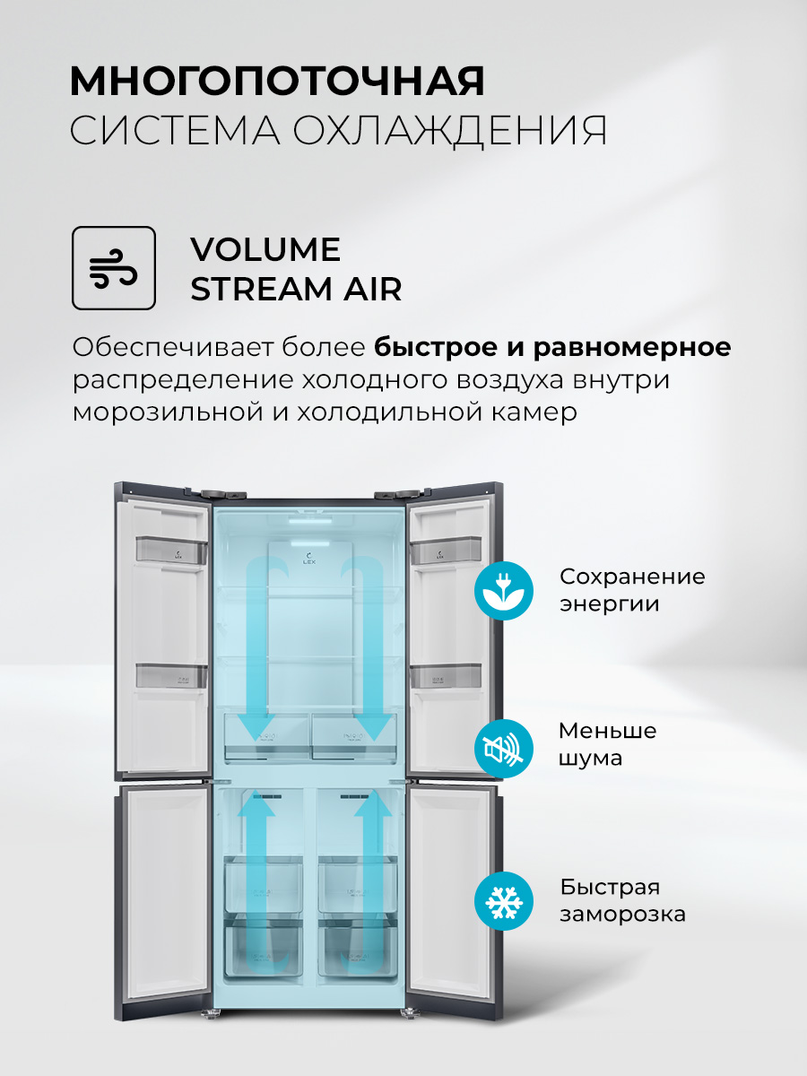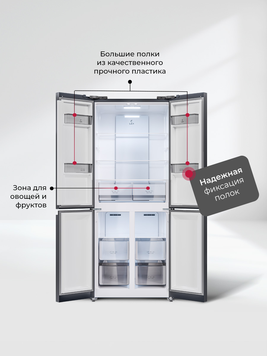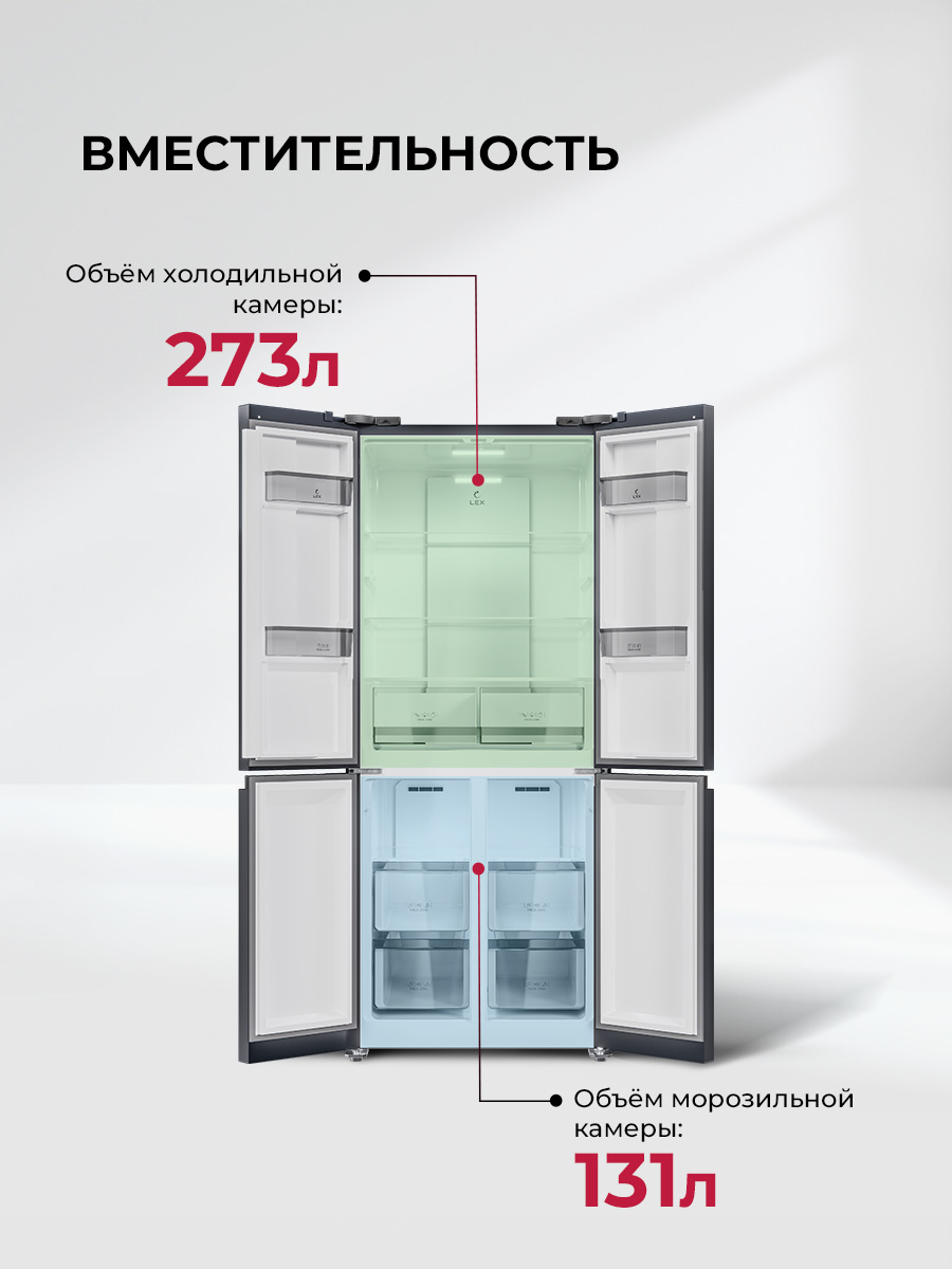 LCD432 — холодильник с двумя морозильными отделениями и самой современной технической начинкой. Благодаря конструкции CROSS DOOR и удобной электронной панели управления со светодиодными индикаторами в рабочих камерах всегда легко поддерживать наиболее подходящие параметры хранения. Большой холодильник с энергоэффективным инверторным компрессором имеет систему охлаждения Total No Frost, поэтому не требует разморозки. Запатентованная вентиляционная система Volume Stream Air равномерно распределяет холодный воздух по всем отделениям и зонам. Яркие LED-лампы помогут быстро найти все любимые продукты даже при максимальной загрузке холодильника. Модель имеет температурный диапазон от +8 °С в холодильном до –23 °С в морозильном отделении. А функция суперзаморозки быстро устанавливает значение –28 °С. Холодильная камера тоже оснащена режимом ускоренного охлаждения. При отключении света также пригодится функция сохранения температуры на 12 часов. Модель представлена в сером и белом металлическом оформлении. Ширина 76 см подойдет для любой, даже небольшой кухни. С холодильником LEX LCD432 ваши мечты станут реальностью!