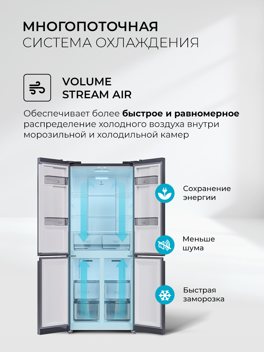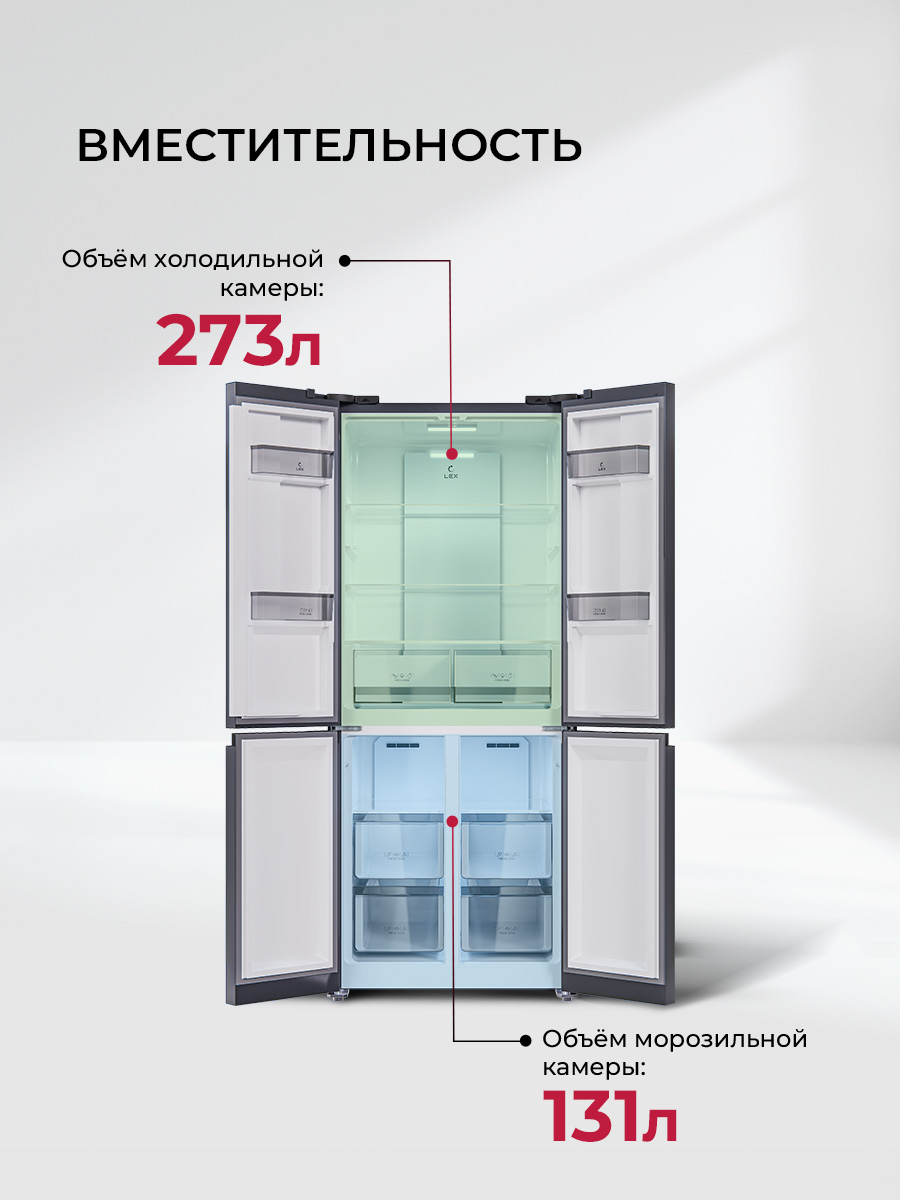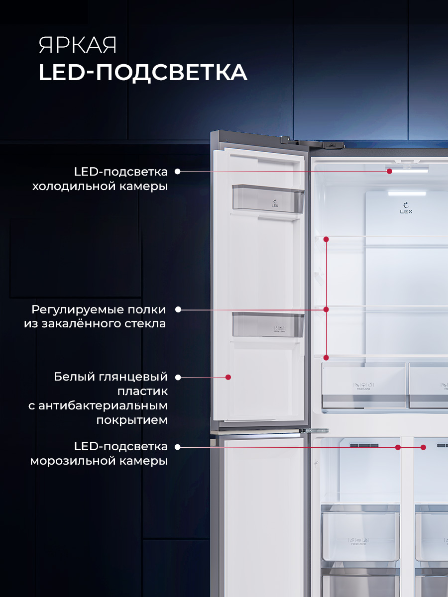 LCD432 — холодильник с двумя морозильными отделениями и самой современной технической начинкой. Благодаря конструкции CROSS DOOR и удобной электронной панели управления со светодиодными индикаторами в рабочих камерах всегда легко поддерживать наиболее подходящие параметры хранения. Большой холодильник с энергоэффективным инверторным компрессором имеет систему охлаждения Total No Frost, поэтому не требует разморозки. Запатентованная вентиляционная система Volume Stream Air равномерно распределяет холодный воздух по всем отделениям и зонам. Яркие LED-лампы помогут быстро найти все любимые продукты даже при максимальной загрузке холодильника. Модель имеет температурный диапазон от +8 °С в холодильном до –23 °С в морозильном отделении. А функция суперзаморозки быстро устанавливает значение –28 °С. Холодильная камера тоже оснащена режимом ускоренного охлаждения. При отключении света также пригодится функция сохранения температуры на 12 часов. Модель представлена в сером и белом металлическом оформлении. Ширина 76 см подойдет для любой, даже небольшой кухни. С холодильником LEX LCD432 ваши мечты станут реальностью!