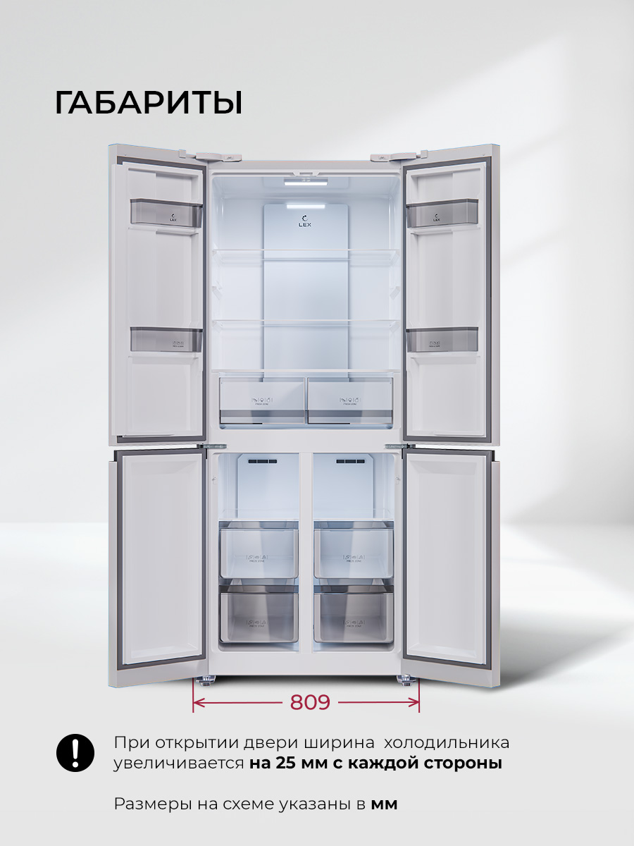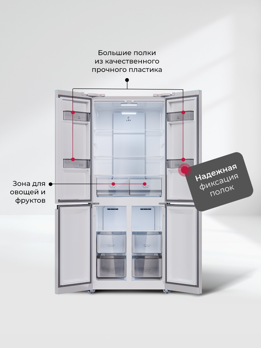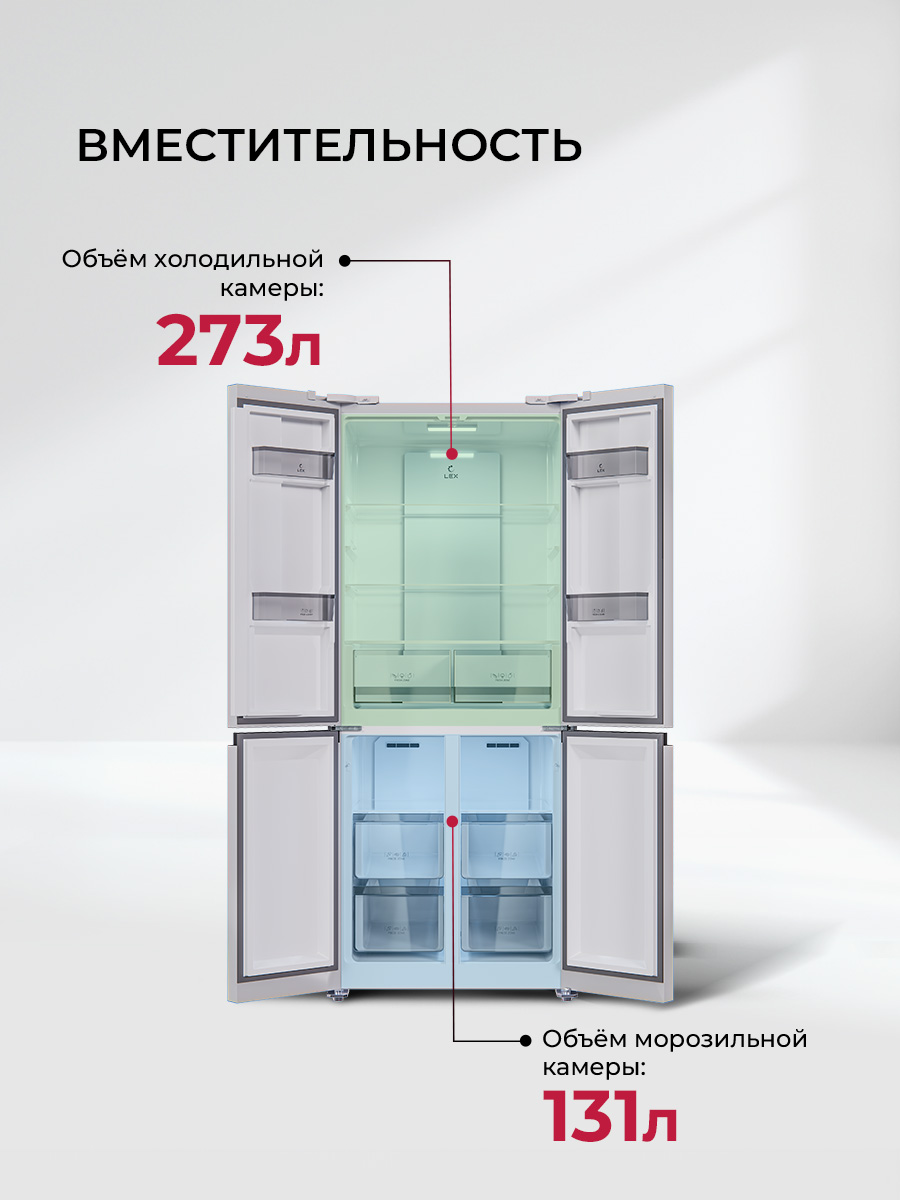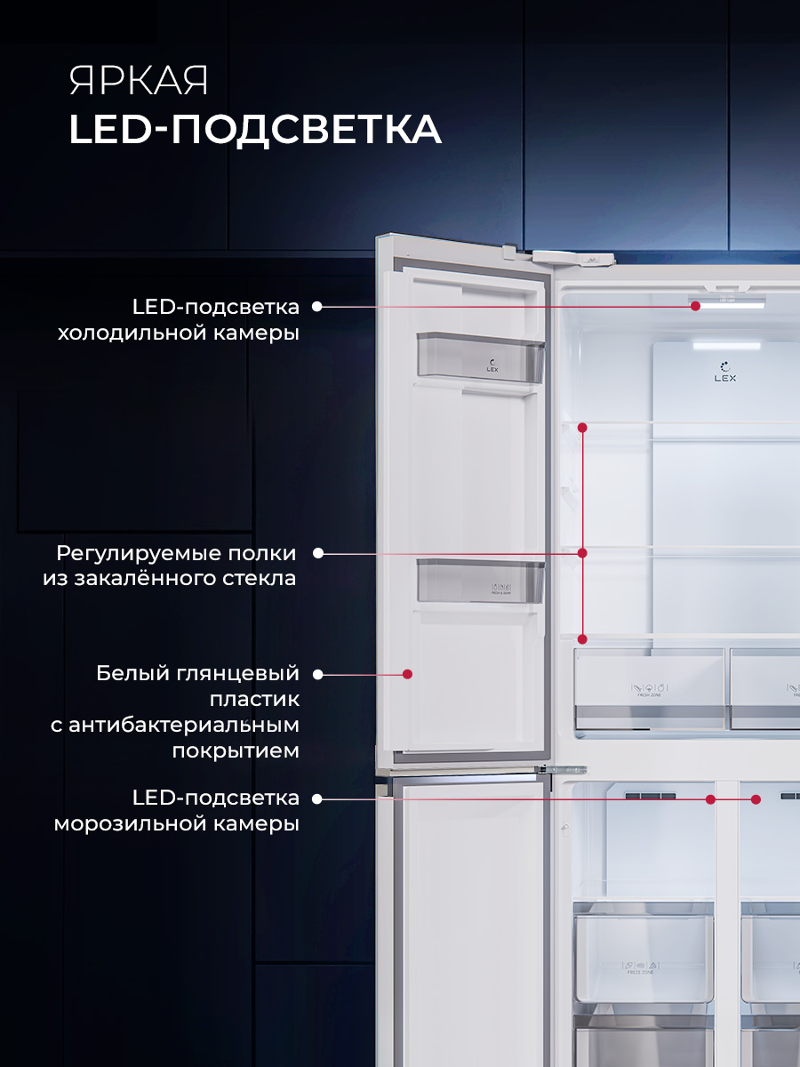 LCD432 — холодильник с двумя морозильными отделениями и самой современной технической начинкой. Благодаря конструкции CROSS DOOR и удобной электронной панели управления со светодиодными индикаторами в рабочих камерах всегда легко поддерживать наиболее подходящие параметры хранения. Большой холодильник с энергоэффективным инверторным компрессором имеет систему охлаждения Total No Frost, поэтому не требует разморозки. Запатентованная вентиляционная система Volume Stream Air равномерно распределяет холодный воздух по всем отделениям и зонам. Яркие LED-лампы помогут быстро найти все любимые продукты даже при максимальной загрузке холодильника. Модель имеет температурный диапазон от +8 °С в холодильном до –23 °С в морозильном отделении. А функция суперзаморозки быстро устанавливает значение –28 °С. Холодильная камера тоже оснащена режимом ускоренного охлаждения. При отключении света также пригодится функция сохранения температуры на 12 часов. Модель представлена в сером и белом металлическом оформлении. Ширина 76 см подойдет для любой, даже небольшой кухни. С холодильником LEX LCD432 ваши мечты станут реальностью!