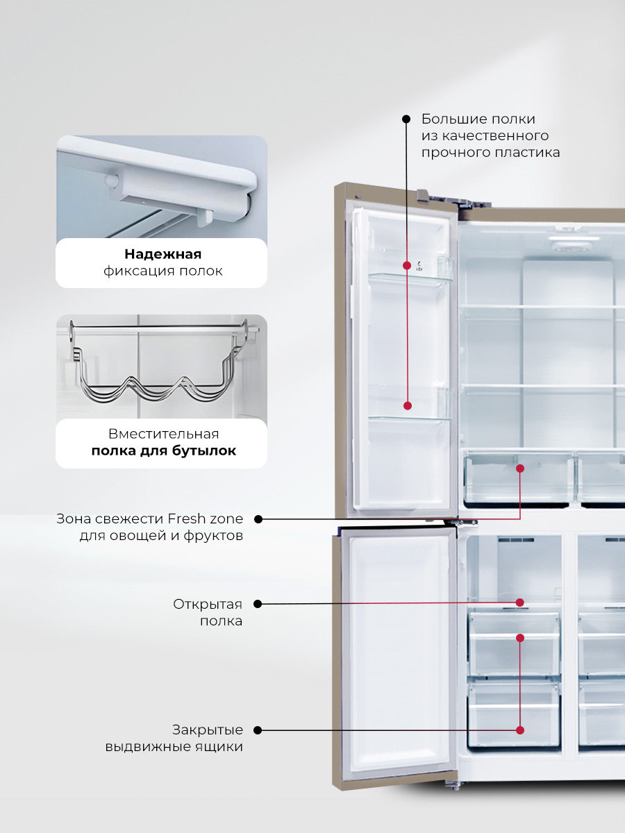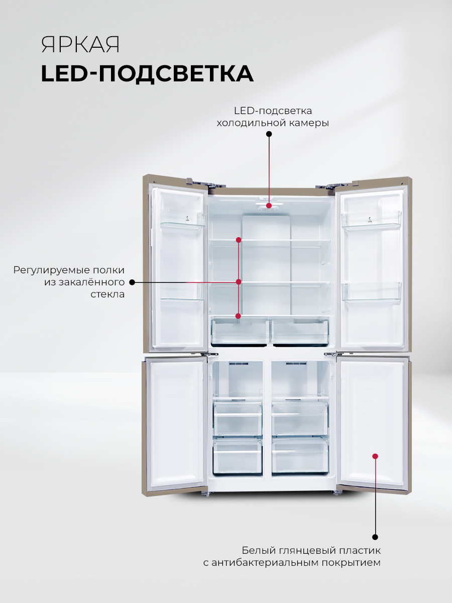 Модель LEX LCD 450 — передовые технологии и множество вариантов дизайна. Удобная панель управления и расположение дверей по типу CROSS DOOR помогут поддерживать нужные параметры хранения для каждого отделения. Холодильник с мощным, экономичным и тихим инверторным компрессором работает по технологии Total No Frost, которая не дает инею скапливаться внутри рабочих камер, значительно упрощая уход за устройством. Запатентованная многопоточная система охлаждения быстро и равномерно распределяет холодный воздух по всем зонам хранения. Модель позволяет хранить продукты при температуре от +8 °С в холодильном отделении до –23 °С в морозильном. А в режиме суперзаморозки можно установить еще более низкое значение: –28 °С. Суперрежимы позволяют максимально охладить содержимое во всех отделениях за короткое время. Это удобно, если вы загружаете сразу много продуктов, например, после похода в супермаркет или отключения электричества. В последнем случае также может пригодиться режим поддержания температуры, который будет работать 10 часов. Еще одна полезная функция — «Отпуск»: когда она активна, в каждой камере устанавливается температура, оптимальная одновременно и для сохранения свежести продуктов, и для уменьшения расхода электричества. Для этого холодильника можно выбрать один из шести стилей матового или глянцевого, стеклянного или металлического корпуса в разных цветах.