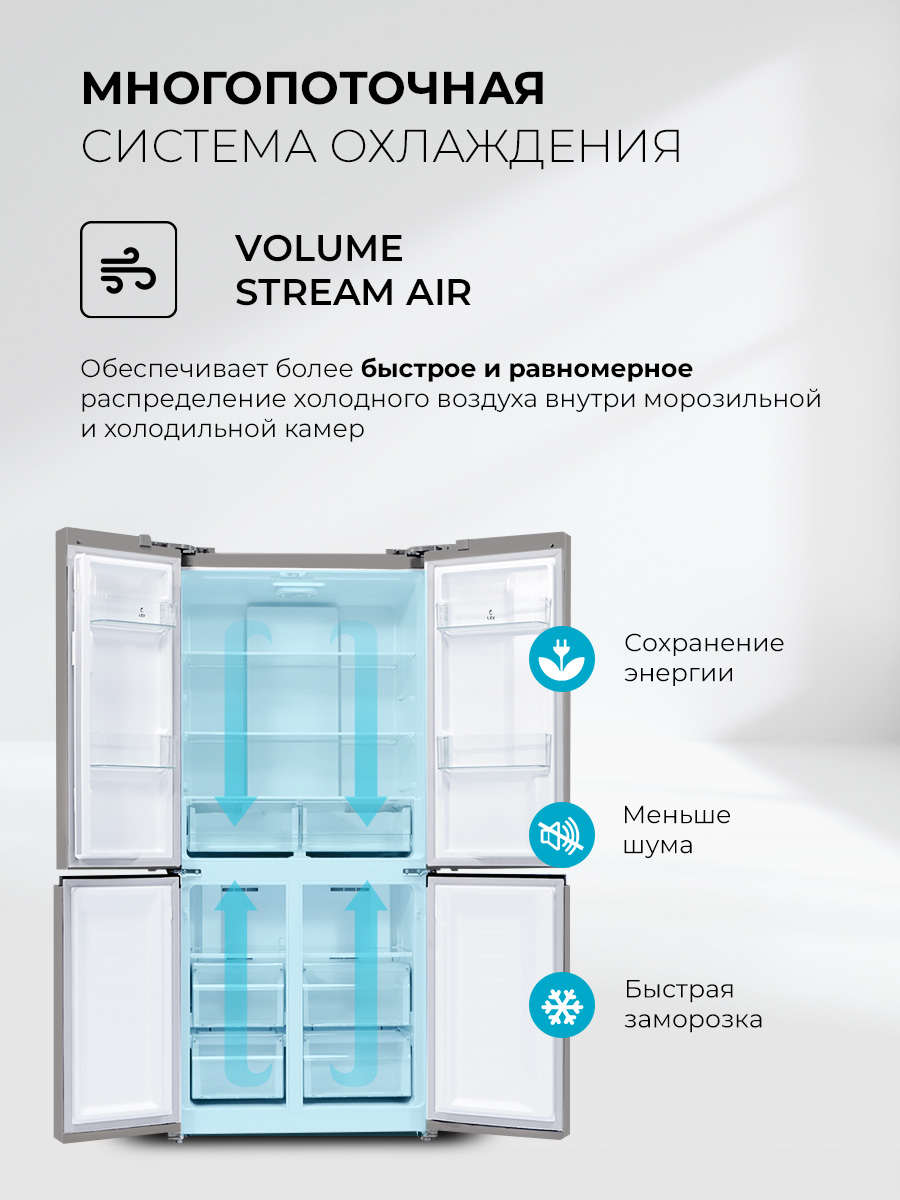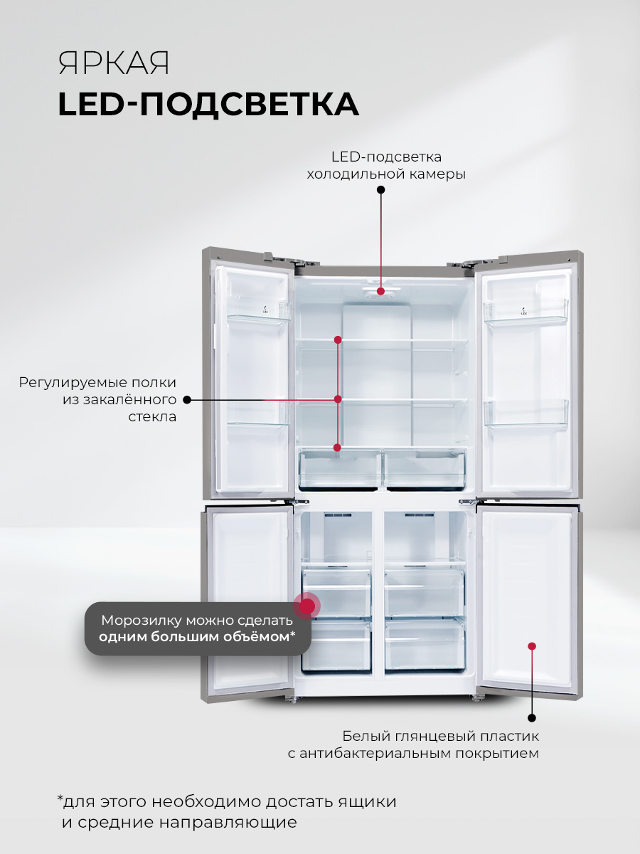 Модель LEX LCD 450 — передовые технологии и множество вариантов дизайна. Удобная панель управления и расположение дверей по типу CROSS DOOR помогут поддерживать нужные параметры хранения для каждого отделения. Холодильник с мощным, экономичным и тихим инверторным компрессором работает по технологии Total No Frost, которая не дает инею скапливаться внутри рабочих камер, значительно упрощая уход за устройством. Запатентованная многопоточная система охлаждения быстро и равномерно распределяет холодный воздух по всем зонам хранения. Модель позволяет хранить продукты при температуре от +8 °С в холодильном отделении до –23 °С в морозильном. А в режиме суперзаморозки можно установить еще более низкое значение: –28 °С. Суперрежимы позволяют максимально охладить содержимое во всех отделениях за короткое время. Это удобно, если вы загружаете сразу много продуктов, например, после похода в супермаркет или отключения электричества. В последнем случае также может пригодиться режим поддержания температуры, который будет работать 10 часов. Еще одна полезная функция — «Отпуск»: когда она активна, в каждой камере устанавливается температура, оптимальная одновременно и для сохранения свежести продуктов, и для уменьшения расхода электричества. Для этого холодильника можно выбрать один из шести стилей матового или глянцевого, стеклянного или металлического корпуса в разных цветах.