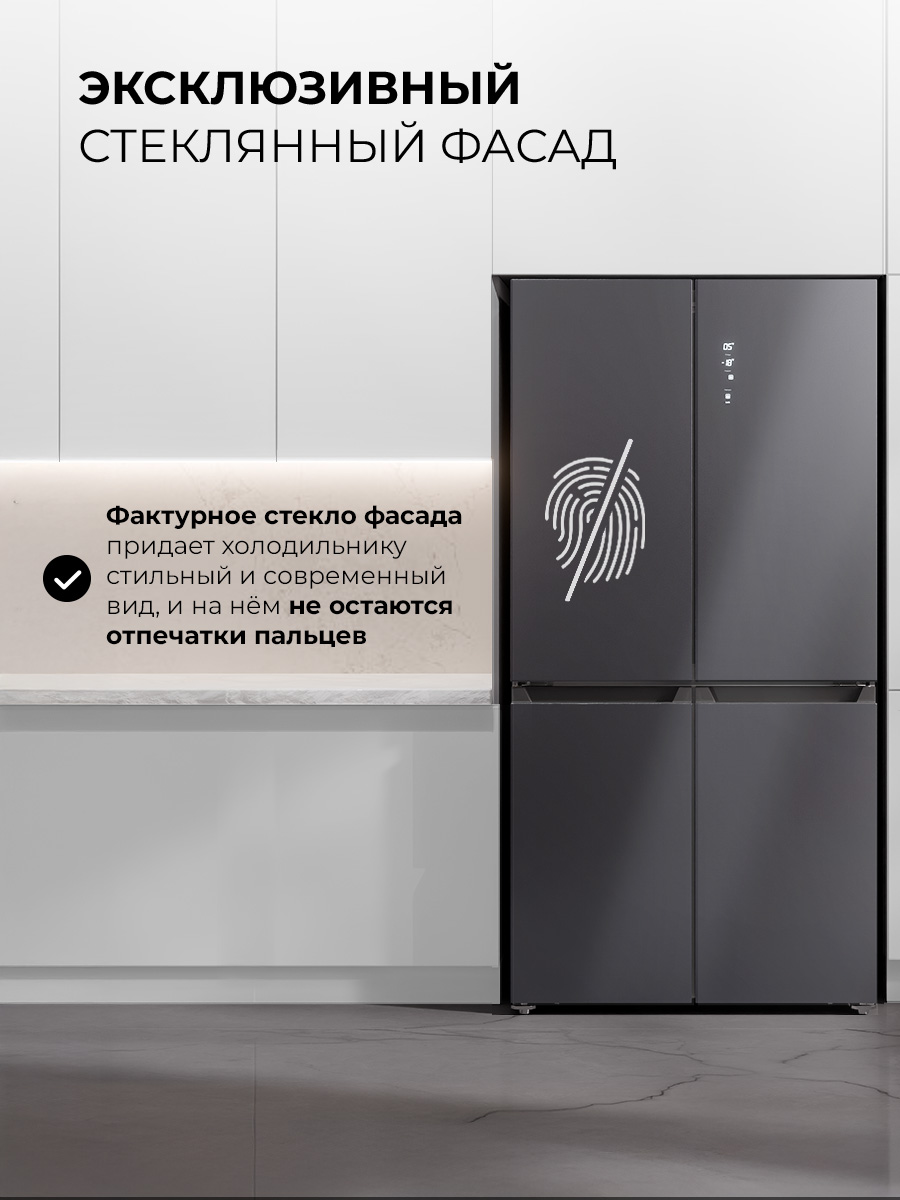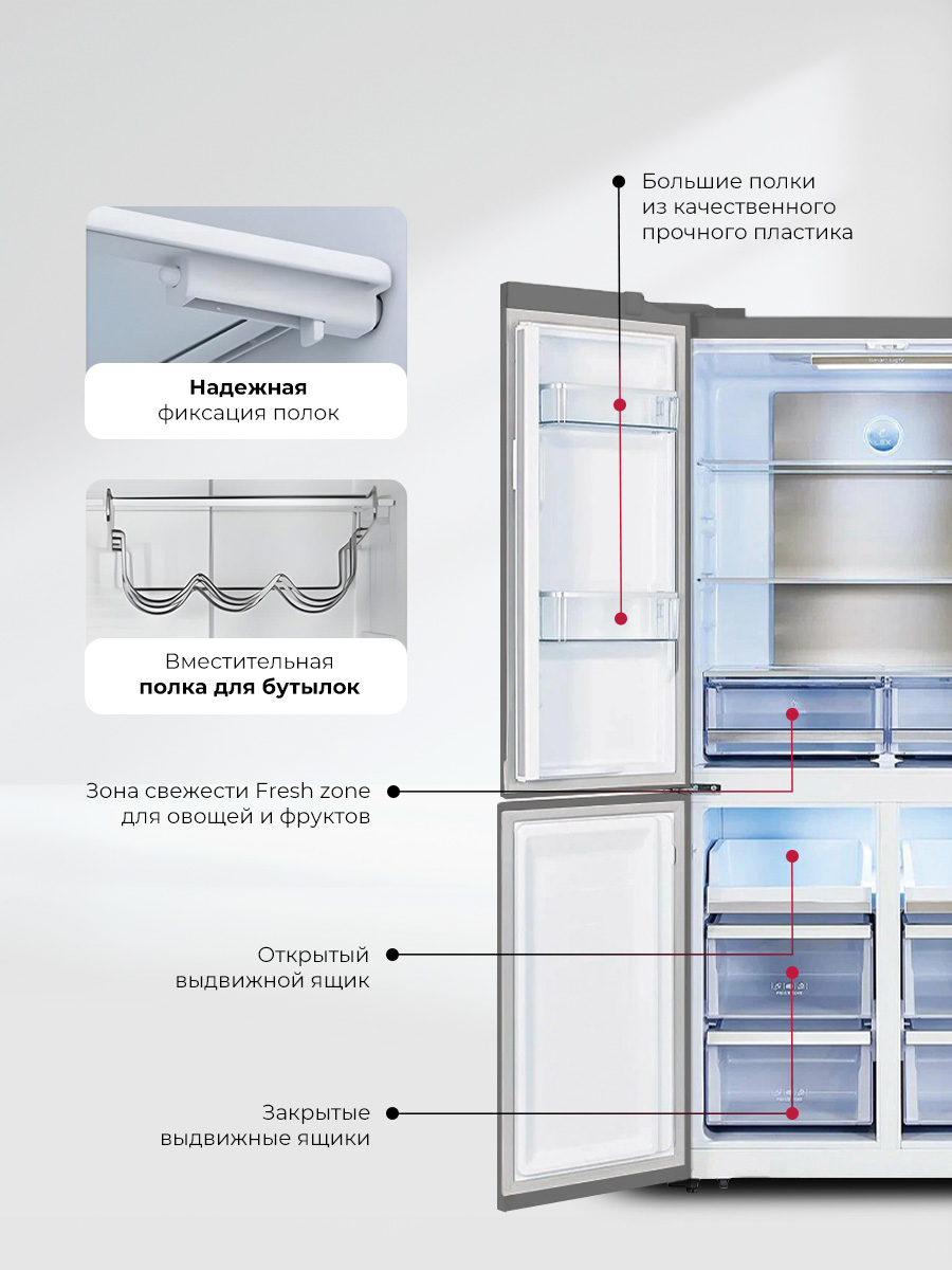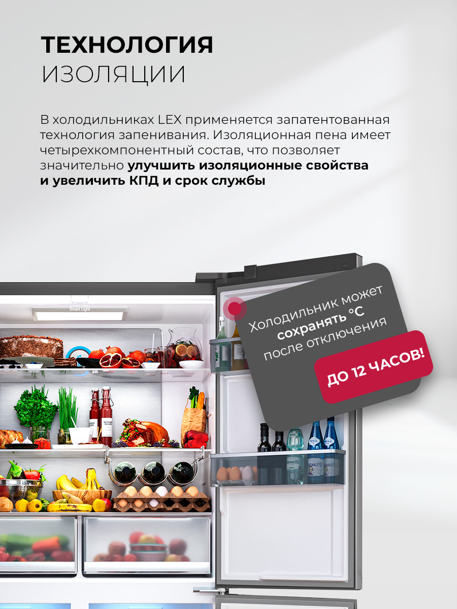 Холодильник LEX LCD 505 станет отличным выбором для большой семьи и стильной кухни. Объем 505 литров позволит разместить все, чего вам захочется. Охлаждение и заморозка происходят по системе No Frost, без образования инея, поэтому вам не нужно тратить время на размораживание. Современный инверторный компрессор работает эффективнее, тише и быстрее обычного, а технология LEX Volume Stream Air обеспечивает более равномерное охлаждение. Задняя стенка холодильной камеры покрыта металлом с высокой теплопроводностью, благодаря чему система охлаждения быстрее выравнивает колебания температуры. Модель типа CROSS DOOR имеет верхнее холодильное и два независимых нижних морозильных отделения. Такая конструкция помогает поддерживать подходящие условия хранения внутри каждой камеры, даже если вы часто открываете дверцы. Диапазон температур: +8…–23 °C, но с функцией суперзаморозки можно быстро снизить температуру в морозильном отделении до –28 °С. Похожий режим есть и в холодильной камере. Холодильник оснащен функцией сохранения температуры в течение 12 часов, которая выручит при отключении электричества. Благодаря понятной электронной панели управления и яркой подсветке вы всегда сможете точно контролировать условия хранения. А когда такой возможности нет, будет достаточно одного нажатия, чтобы автоматически установить в каждом отделении температуры, которые позволяют экономить энергию, но не влияют на качество хранения продуктов. Модель представлена в восьми вариантах оформления, которые отличаются цветом, текстурой и материалом отделки.