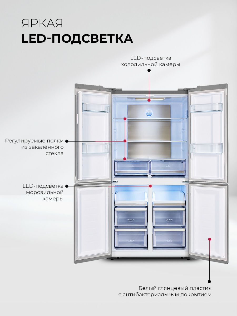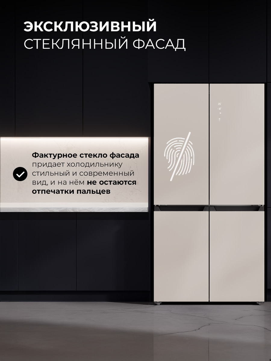 Холодильник LEX LCD 505 станет отличным выбором для большой семьи и стильной кухни. Объем 505 литров позволит разместить все, чего вам захочется. Охлаждение и заморозка происходят по системе No Frost, без образования инея, поэтому вам не нужно тратить время на размораживание. Современный инверторный компрессор работает эффективнее, тише и быстрее обычного, а технология LEX Volume Stream Air обеспечивает более равномерное охлаждение. Задняя стенка холодильной камеры покрыта металлом с высокой теплопроводностью, благодаря чему система охлаждения быстрее выравнивает колебания температуры. Модель типа CROSS DOOR имеет верхнее холодильное и два независимых нижних морозильных отделения. Такая конструкция помогает поддерживать подходящие условия хранения внутри каждой камеры, даже если вы часто открываете дверцы. Диапазон температур: +8…–23 °C, но с функцией суперзаморозки можно быстро снизить температуру в морозильном отделении до –28 °С. Похожий режим есть и в холодильной камере. Холодильник оснащен функцией сохранения температуры в течение 12 часов, которая выручит при отключении электричества. Благодаря понятной электронной панели управления и яркой подсветке вы всегда сможете точно контролировать условия хранения. А когда такой возможности нет, будет достаточно одного нажатия, чтобы автоматически установить в каждом отделении температуры, которые позволяют экономить энергию, но не влияют на качество хранения продуктов. Модель представлена в восьми вариантах оформления, которые отличаются цветом, текстурой и материалом отделки.