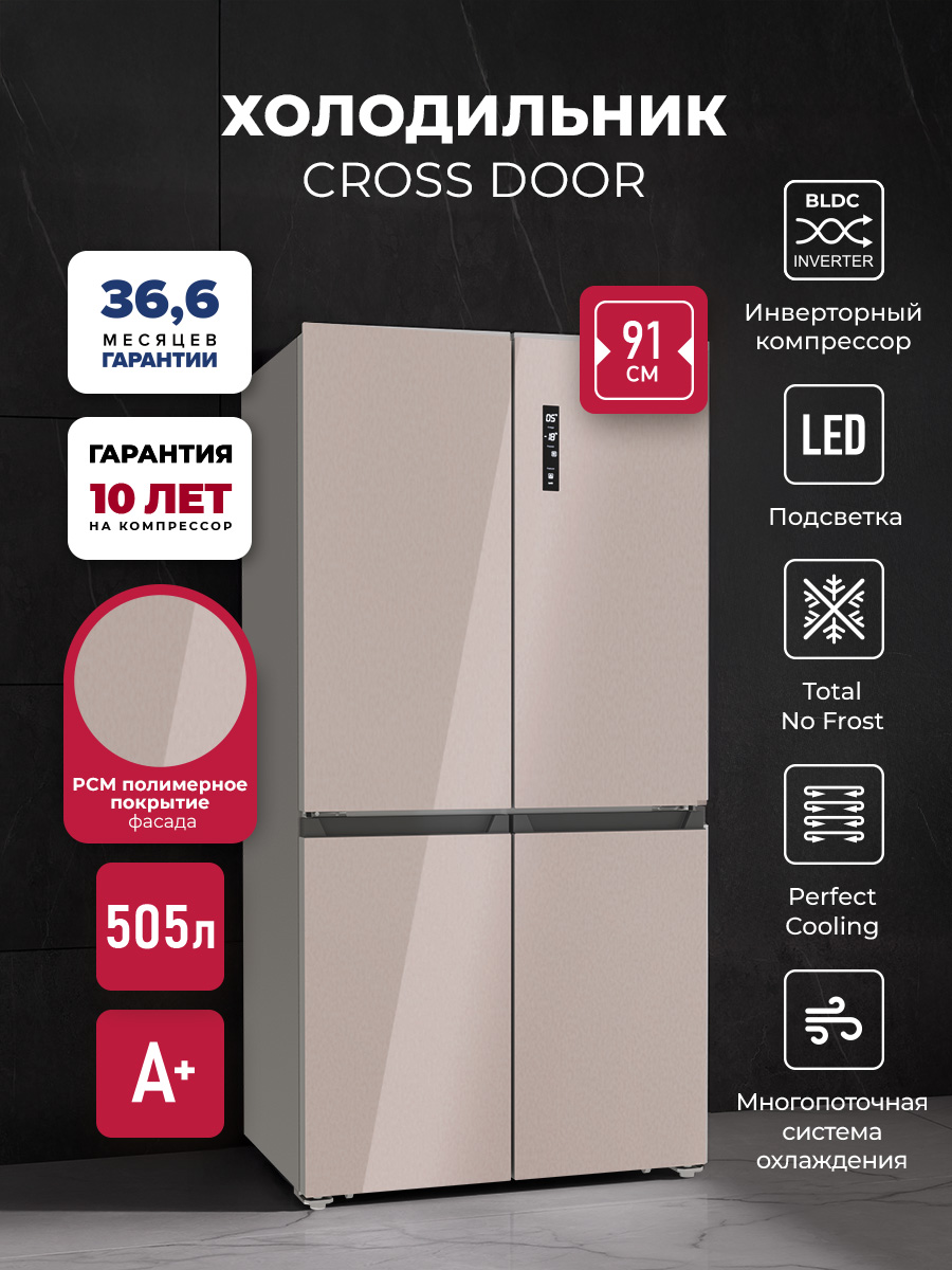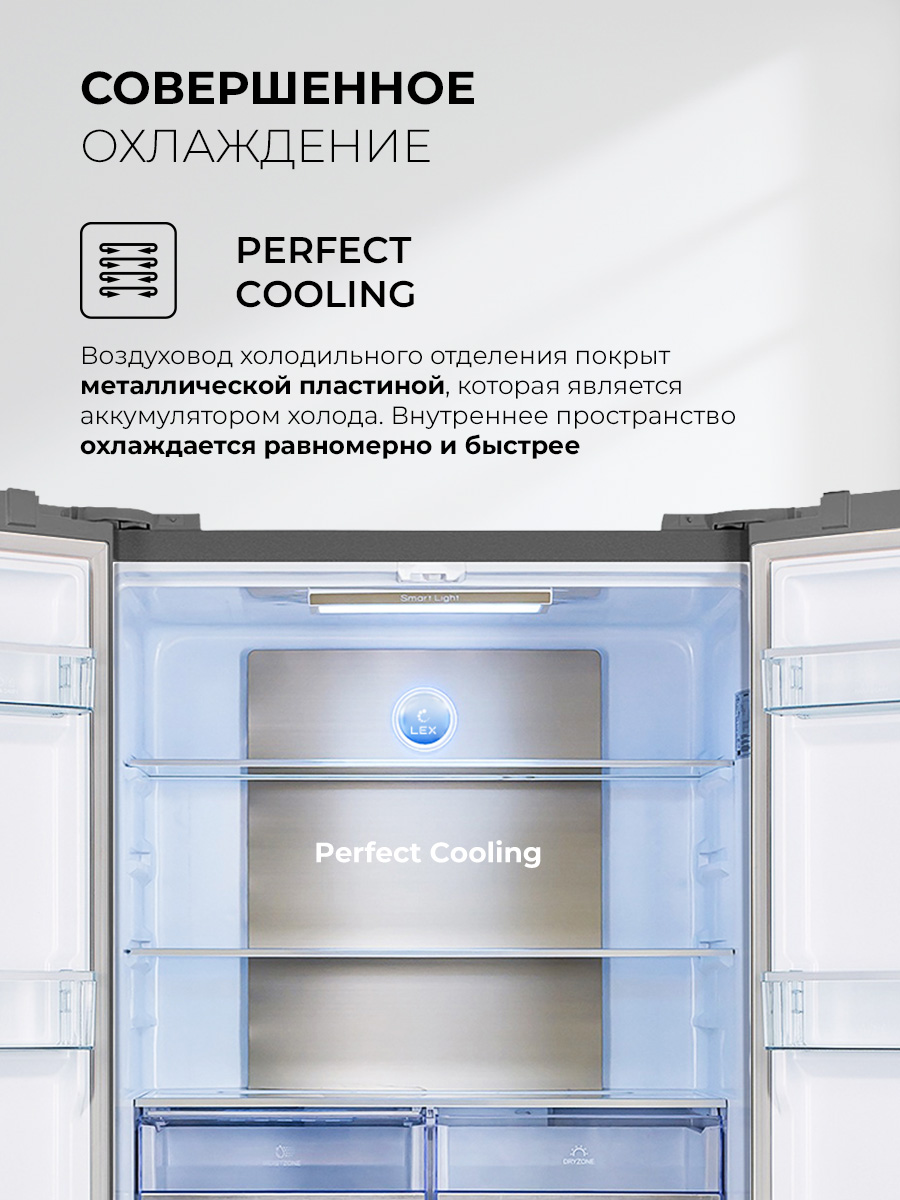 Холодильник LEX LCD 505 станет отличным выбором для большой семьи и стильной кухни. Объем 505 литров позволит разместить все, чего вам захочется. Охлаждение и заморозка происходят по системе No Frost, без образования инея, поэтому вам не нужно тратить время на размораживание. Современный инверторный компрессор работает эффективнее, тише и быстрее обычного, а технология LEX Volume Stream Air обеспечивает более равномерное охлаждение. Задняя стенка холодильной камеры покрыта металлом с высокой теплопроводностью, благодаря чему система охлаждения быстрее выравнивает колебания температуры. Модель типа CROSS DOOR имеет верхнее холодильное и два независимых нижних морозильных отделения. Такая конструкция помогает поддерживать подходящие условия хранения внутри каждой камеры, даже если вы часто открываете дверцы. Диапазон температур: +8…–23 °C, но с функцией суперзаморозки можно быстро снизить температуру в морозильном отделении до –28 °С. Похожий режим есть и в холодильной камере. Холодильник оснащен функцией сохранения температуры в течение 12 часов, которая выручит при отключении электричества. Благодаря понятной электронной панели управления и яркой подсветке вы всегда сможете точно контролировать условия хранения. А когда такой возможности нет, будет достаточно одного нажатия, чтобы автоматически установить в каждом отделении температуры, которые позволяют экономить энергию, но не влияют на качество хранения продуктов. Модель представлена в восьми вариантах оформления, которые отличаются цветом, текстурой и материалом отделки.