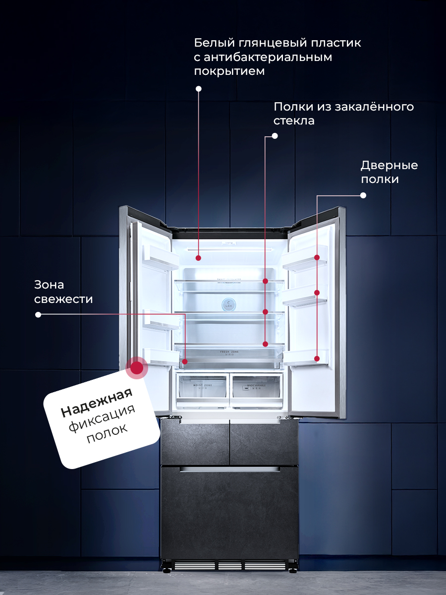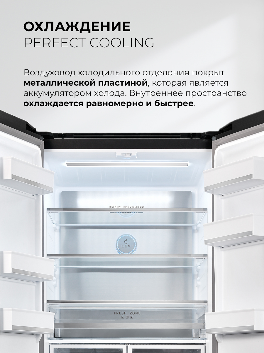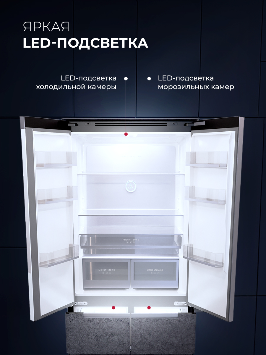 Технология No Frost во всех камерах обеспечивает равномерное охлаждение, исключая образование инея и упрощая уход. Зоны с независимой регулировкой температуры и влажности позволяют настроить идеальные параметры для продуктов, которым нужны особые условия. Функции суперохлаждения и суперзаморозки помогут быстро снизить температуру свежих продуктов, сохранив их вкусовые качества.