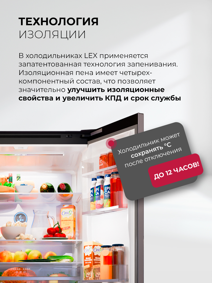 Благодаря практически бесшумному инверторному компрессору холодильник не будет нарушать домашний уют. Такой тип компрессора также гарантирует экономичное энергопотребление, а функция автономного поддержания температуры в течение 19 часов сохранит продукты даже при отключении электричества.