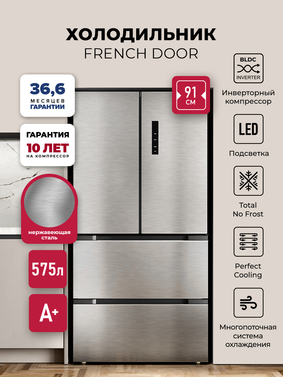 Инверторный компрессор гарантирует долгие годы работы без поломок. Трехкамерный холодильник French Door обеспечивает комфортный доступ к каждому отделению и сводит к минимуму потерю холода. Объема в 510 литров достаточно даже для большой семьи, при этом независимые контуры для хладагента в холодильной и морозильных камерах помогают хранить продукты в каждой из них в оптимальных условиях.