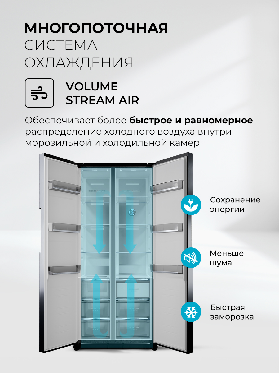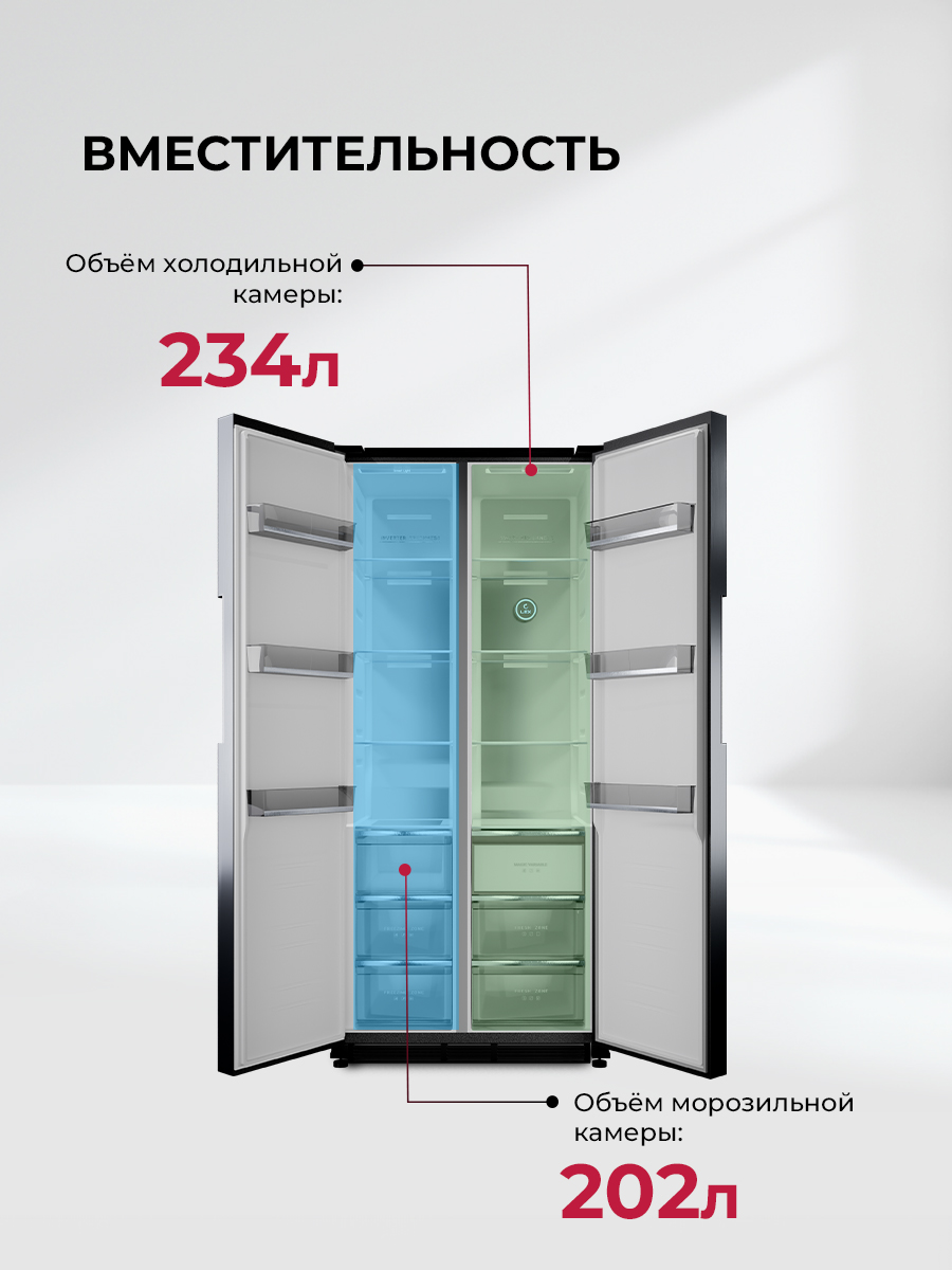 Два отделения общим объемом 436 литров и конструкция Side by Side дают возможность хранить все блюда и напитки на удобном уровне. Внутреннее пространство холодильника организовано максимально эффективно благодаря регулируемым полкам и ящикам в обеих камерах.