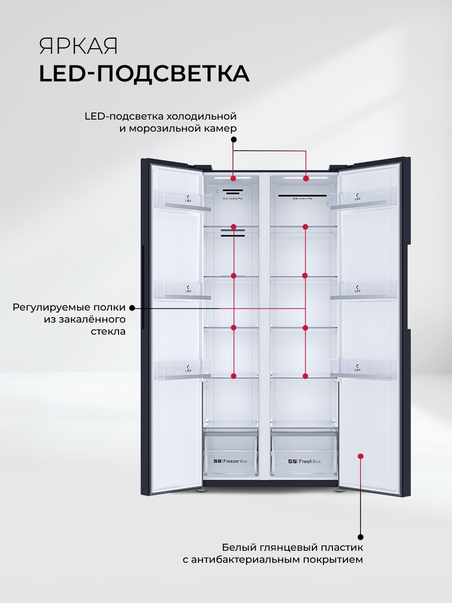 Конструкция холодильника LSB 520 дает возможность хранить как охлажденные, так и замороженные продукты на удобной высоте. Современный инверторный компрессор отличается минимальным уровнем шума и высокой производительностью. Модель оснащена целым набором полезных режимов и функций. Камеры имеют независимые друг от друга контуры охлаждения, благодаря чему любые продукты будут храниться в самых подходящих условиях. Нижний ящик холодильного отделения поддерживает идеальные уровни влажности и температуры для мяса, рыбы, овощей и фруктов. Вентиляция вокруг каждой полки обеспечивает быстрое и равномерное охлаждение. Когда нужно быстро охладить много продуктов, можно одним нажатием установить минимальную температуру, а экономичный режим снизит расход электроэнергии.