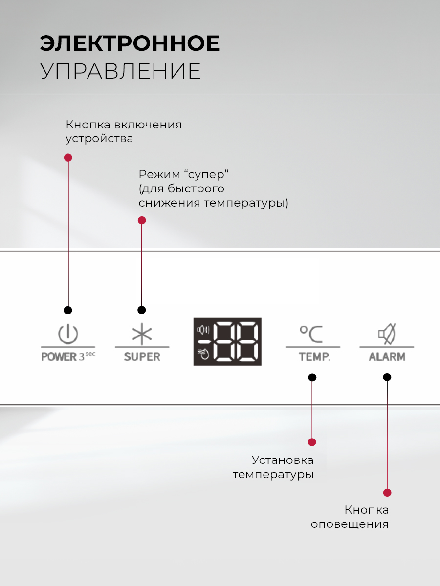 – Шкаф оснащен электронным управлением, что позволяет легко контролировать и настраивать температуру внутри.