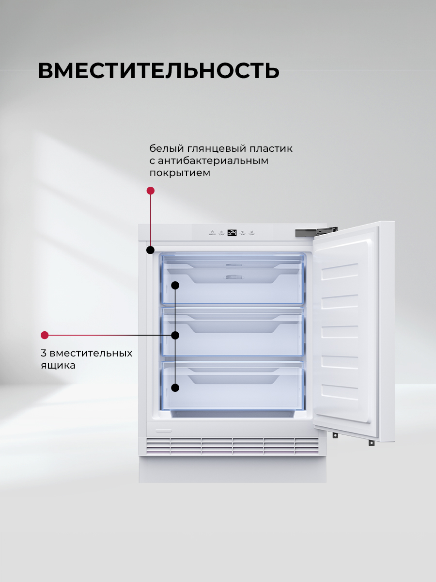 – Мощность замораживания составляет 6 кг в сутки. Морозильный шкаф сохранит свежесть и полезные свойства продуктов на длительное время.
