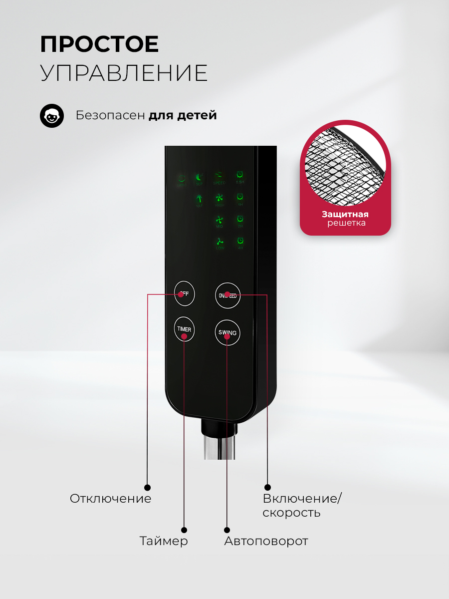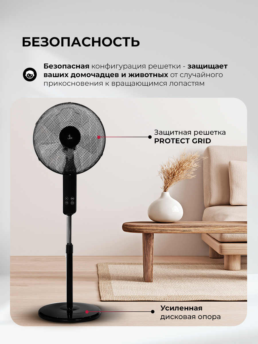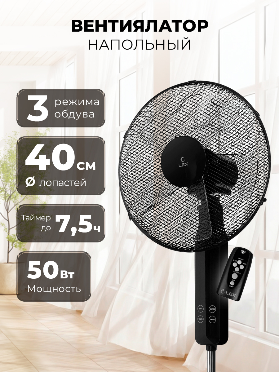 Напольный вентилятор LEX LXFC 8349 сочетает функциональность и строгий тёмный дизайн. Это практичное решение для тех, кто хочет получить мощный обдув и аккуратный внешний вид в одной модели.