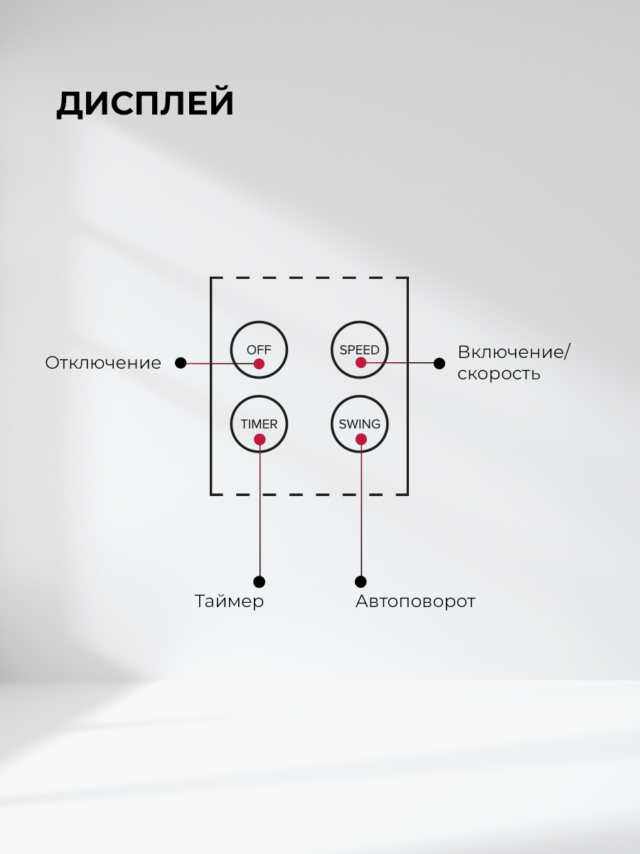 Модель поддерживает три режима работы. Стандартный режим даёт постоянный поток, режим имитации ветра создаёт переменный, естественный обдув, ночной режим плавно меняет интенсивность для комфортного сна. Таймер от 0,5 до 7,5 часов позволяет задать время автоматического отключения, что удобно при вечернем использовании.