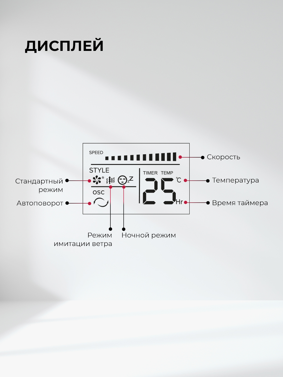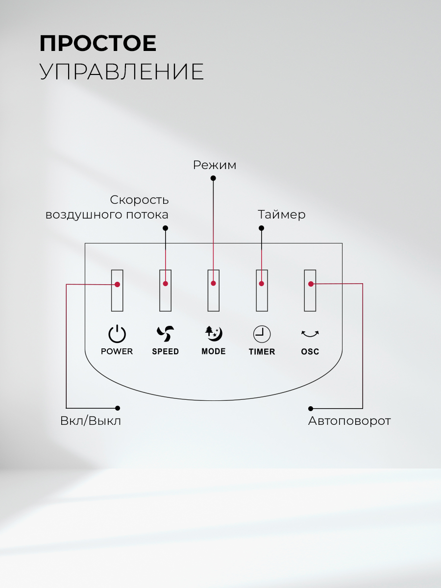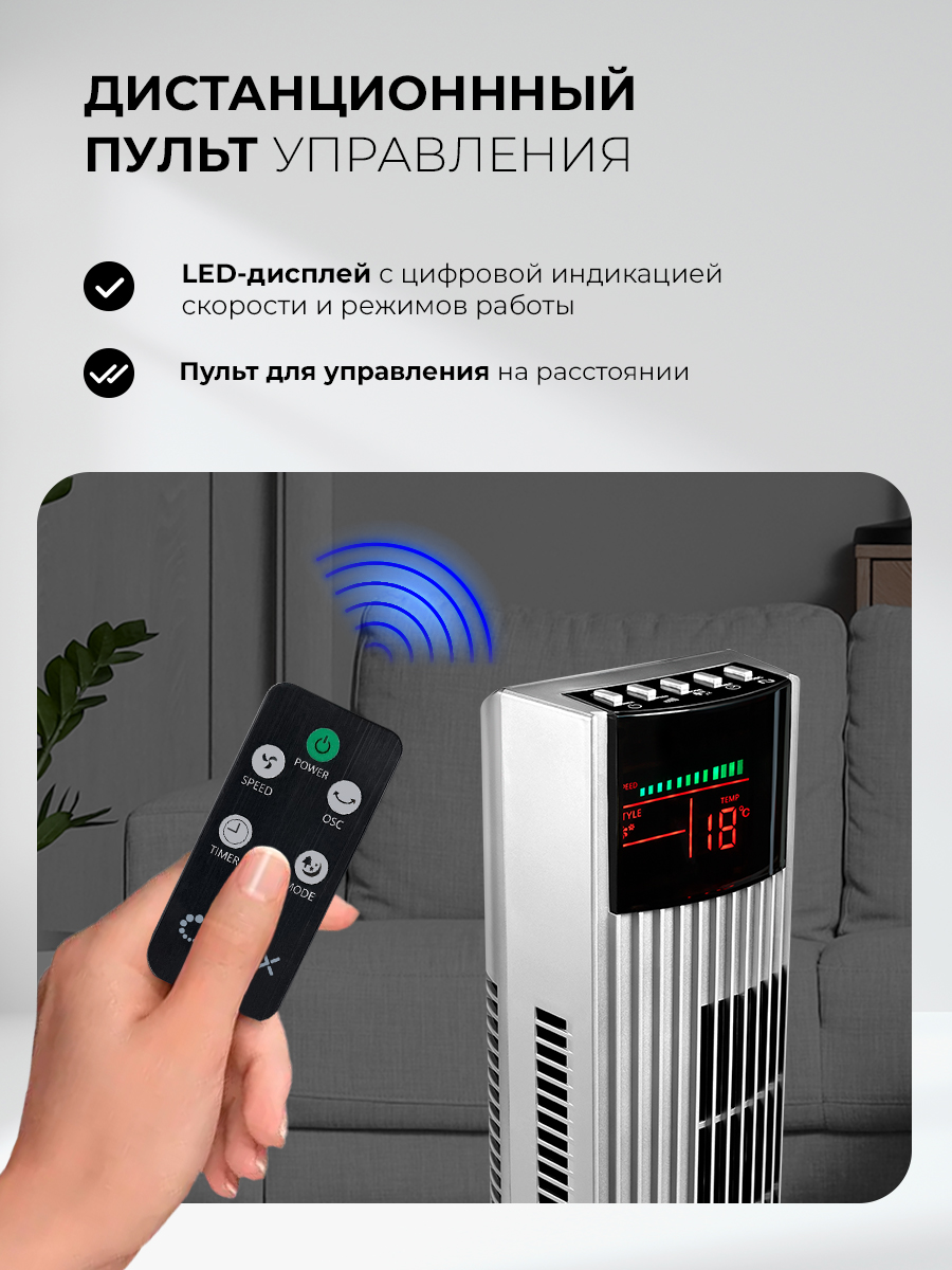 Управление осуществляется с помощью кнопочной панели на корпусе или пульта дистанционного управления. Встроенный LED дисплей отображает выбранные настройки, скорость работы и температуру окружающей среды. Таймер с диапазоном от 1 до 12 часов позволяет задать автоматическое отключение вентилятора в нужное время.
