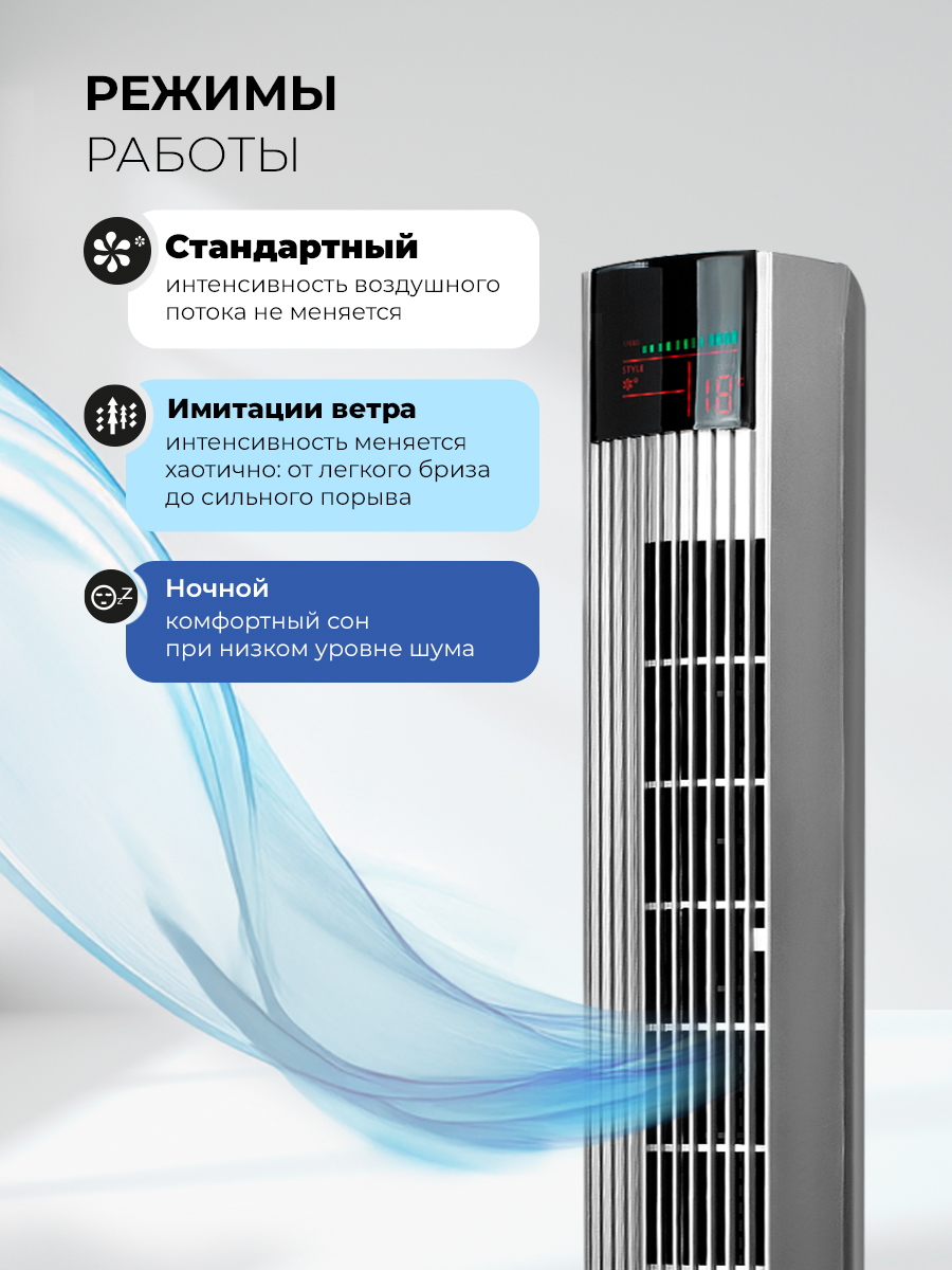 Модель оснащена 3 уровнями скорости и 3 режимами работы, включая стандартный режим, режим имитации ветра и ночной режим. Функция автоповорота способствует равномерному охлаждению помещения.