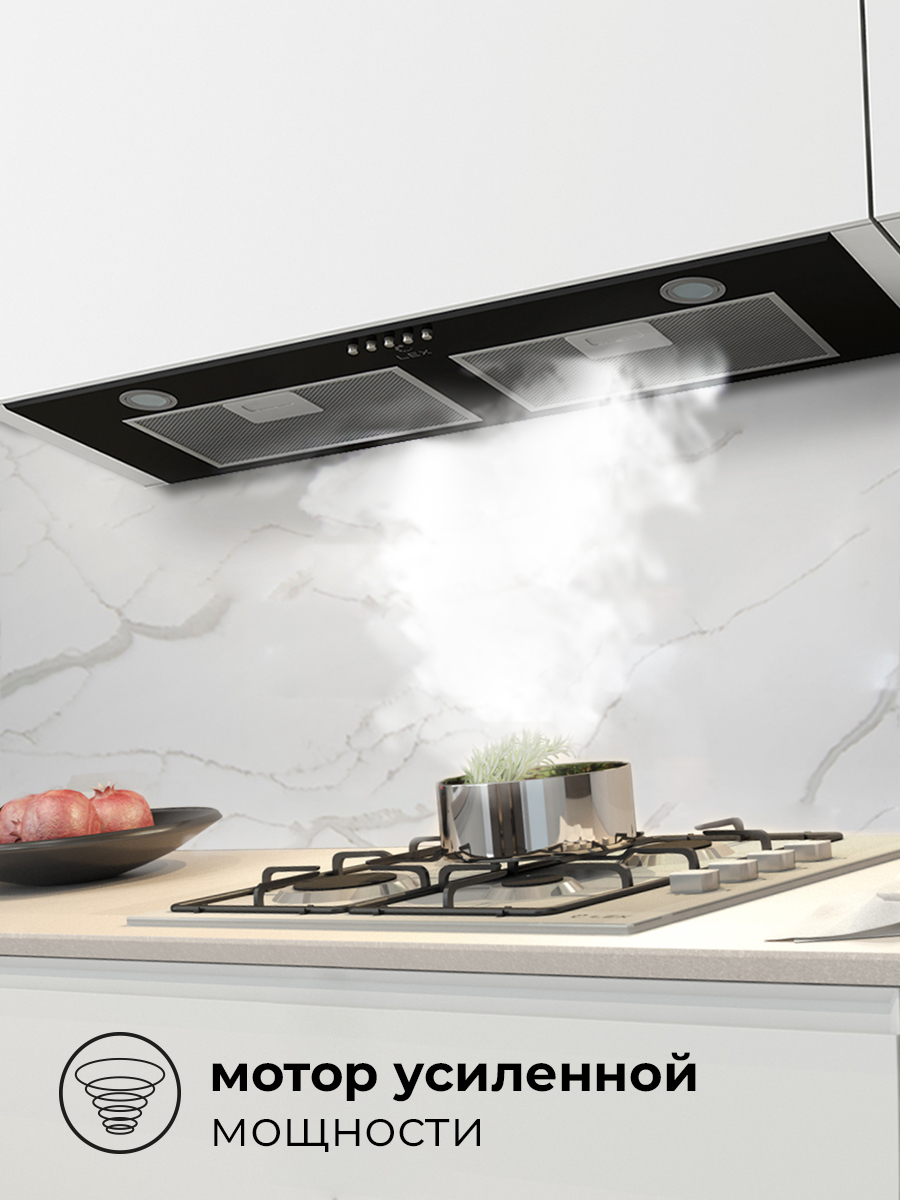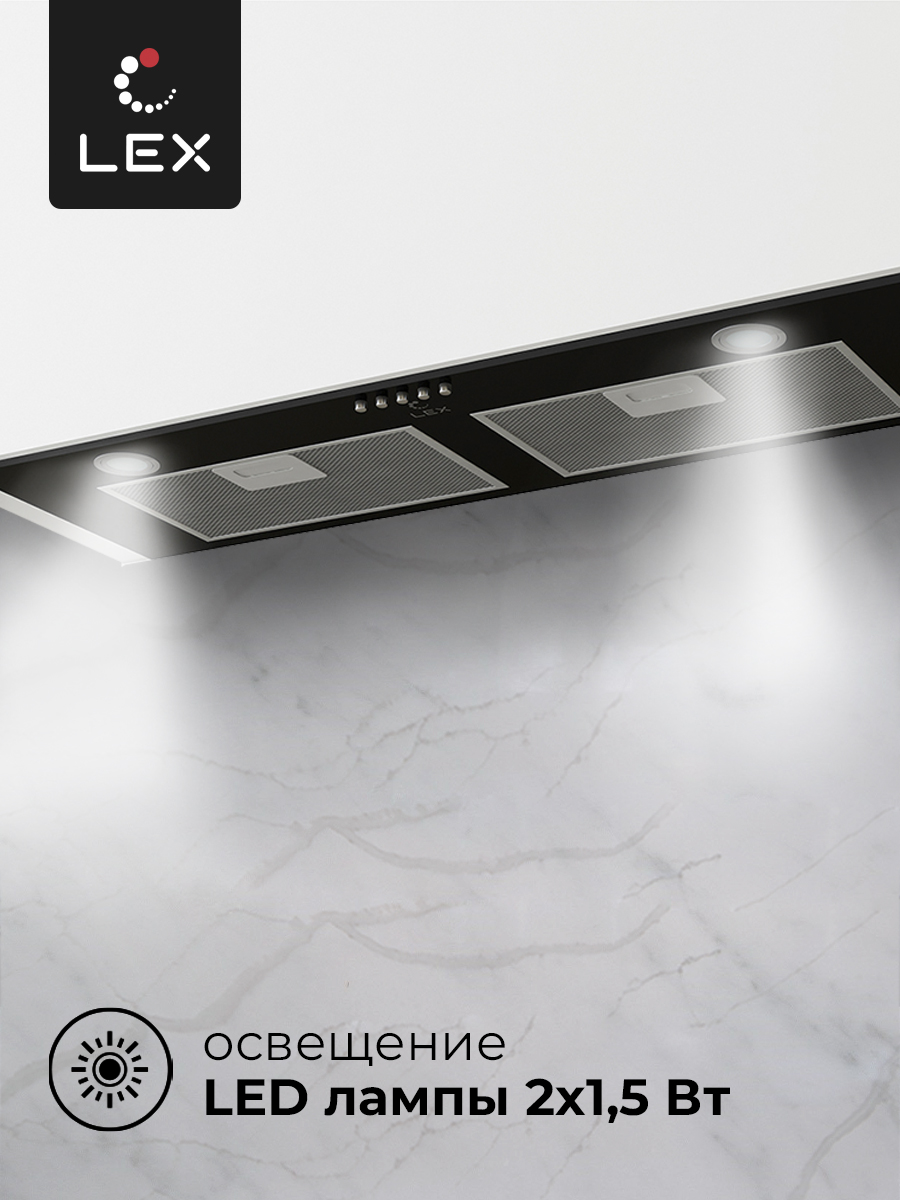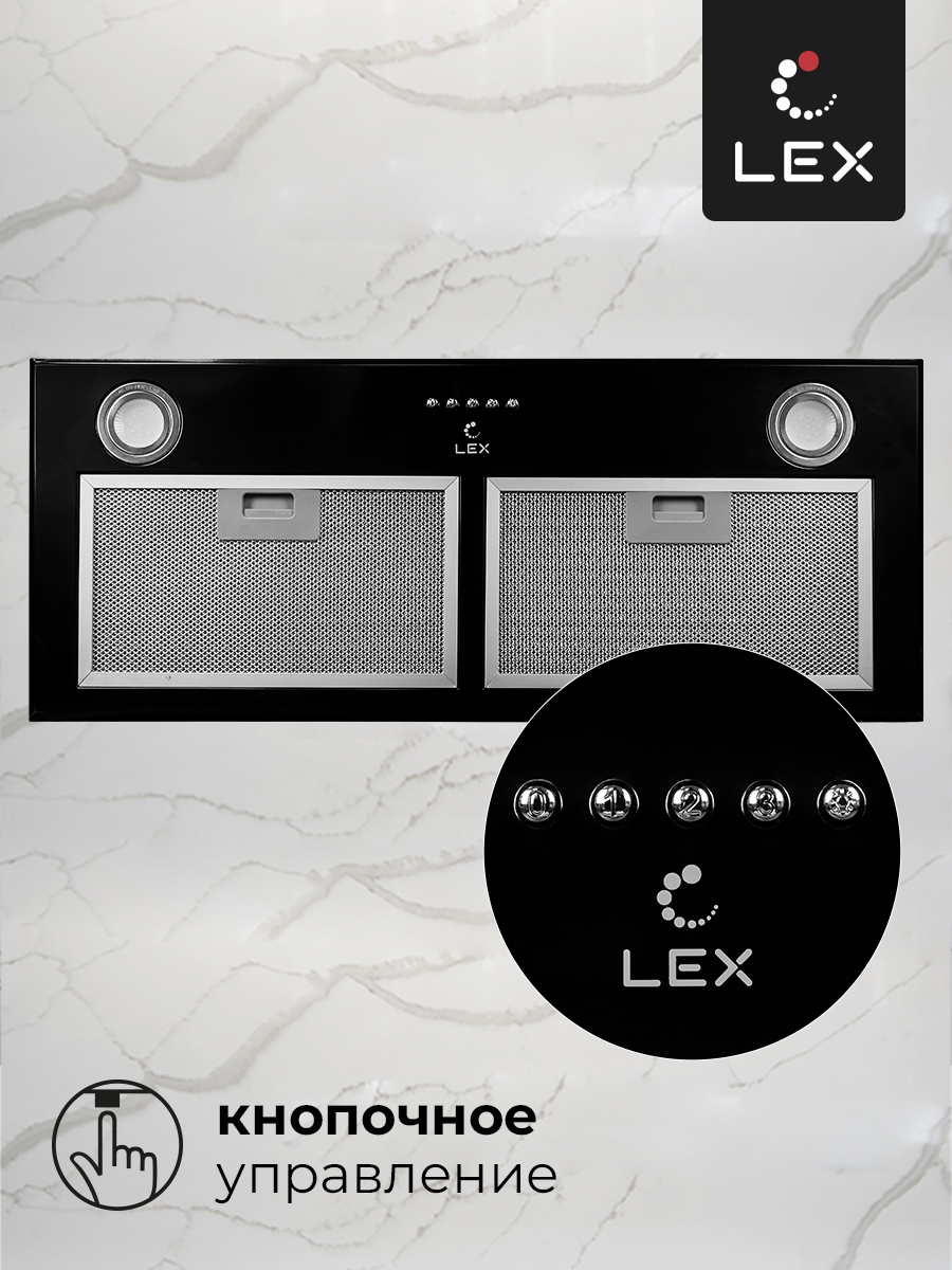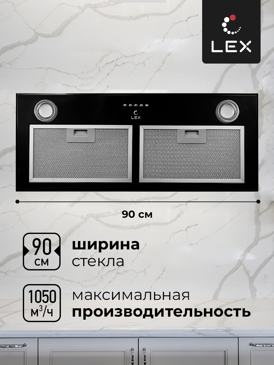 LEX GS BLOC P 900 BLACK – полновстраиваемая вытяжка практически незаметна в интерьере, благодаря чему отлично подходит, как для интерьера в классическом стиле, так и для современного минималистичного пространства. Устройство чёрного цвета имеет интуитивно понятное кнопочное управление. В передней части вытяжки расположена экономичная LED подсветка. Подключение LEX GS BLOC P 900 BLACK возможно, как на отвод воздуха в вентиляцию, так и на режим рециркуляции воздуха. Мотор повышенной мощности обеспечивает уникальные для своего класса показатели производительности.