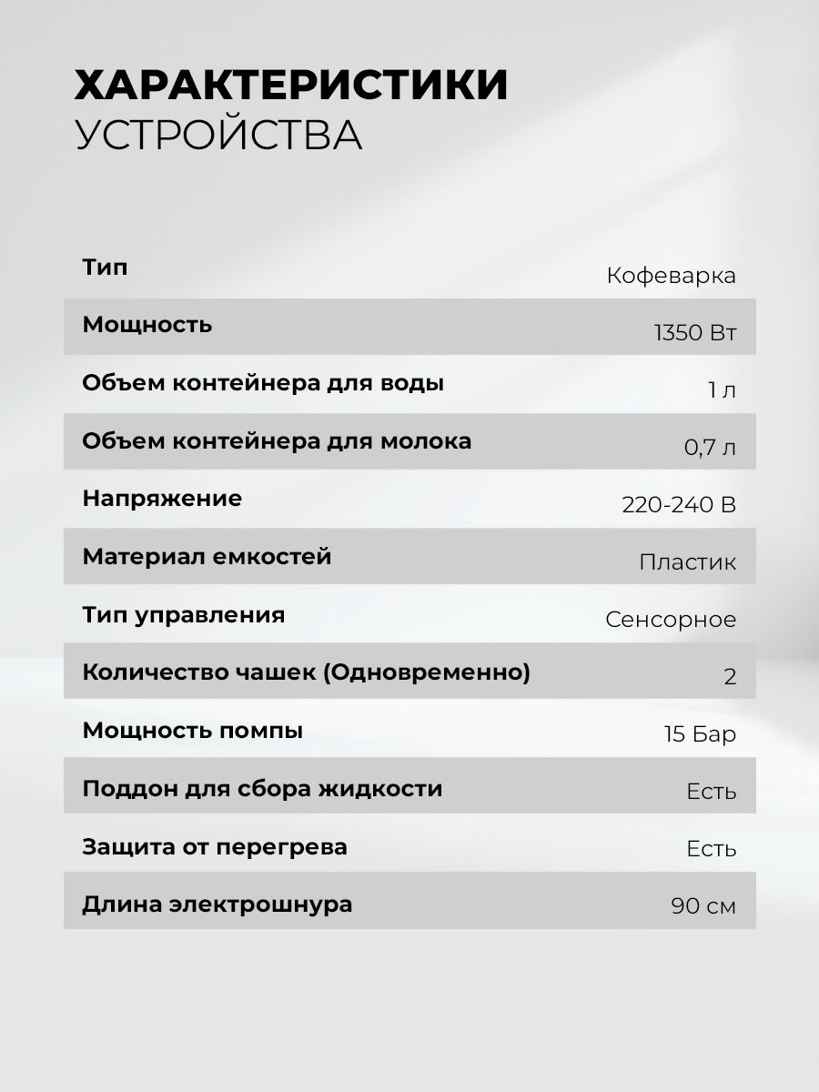 Кофеварка имеет съемные резервуары для воды (1 Л) и молока (0,7 Л), а также съемный поддон для сбора капель, что делает процесс очистки простым и удобным.