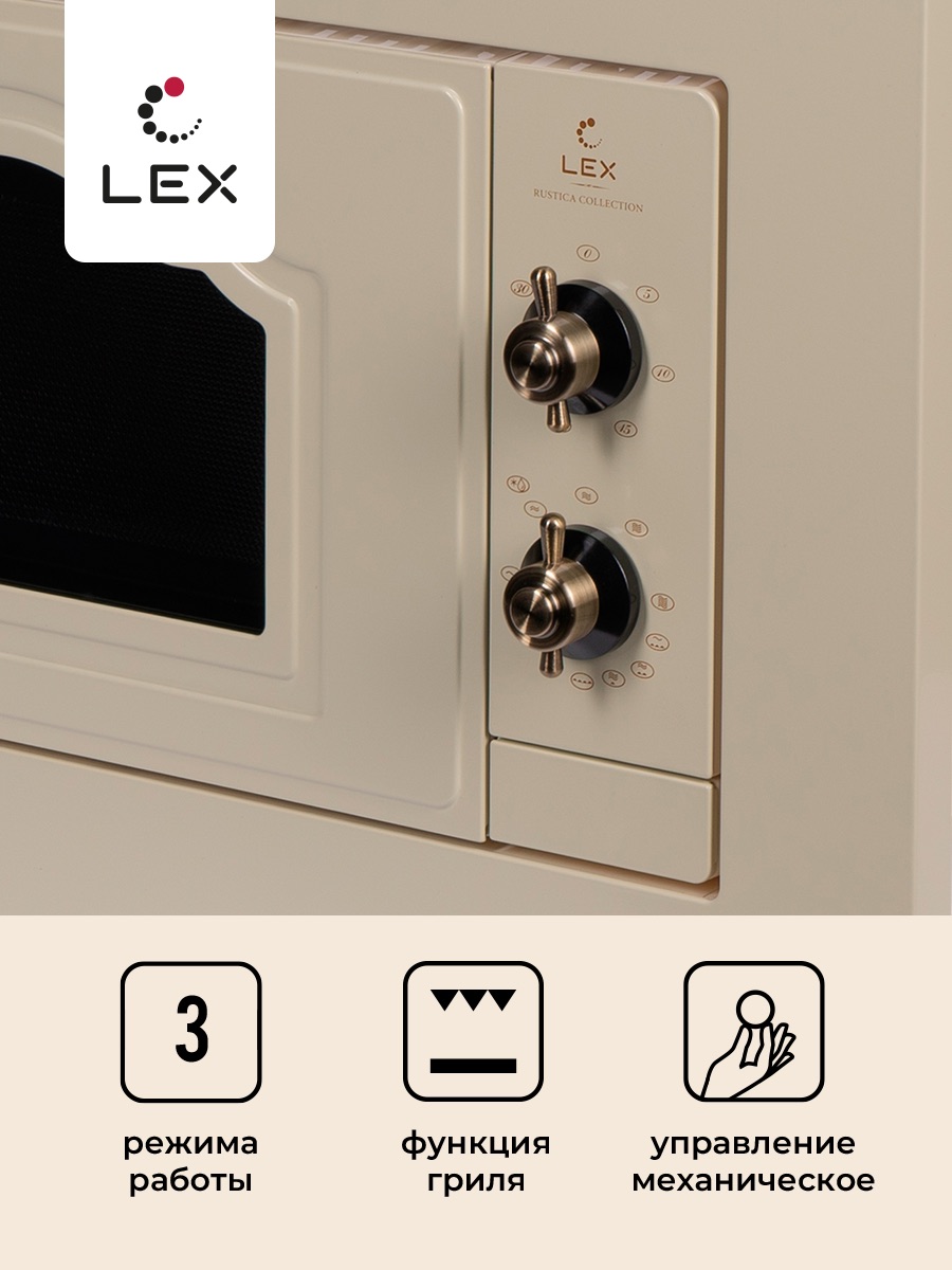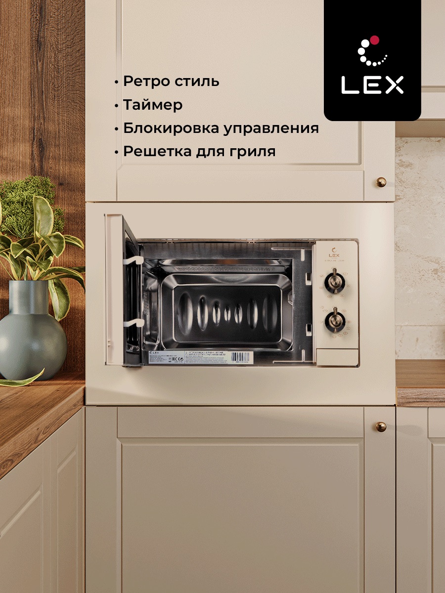 Встраиваемая микроволновая печь LEX BIMO 20.04 IV гармонично интегрируется в окружающую обстановку, не занимая горизонтальные плоскости. Наличие функции гриля с мощностью 800 Вт понравится тем, кто любит многофункциональность, разнообразие, но предпочитает жарить, запекать без добавления масла. Устройство имеет стандартные размеры встраивания, механическое управление, оснащено таймером, дисплеем, звуковым сигналом. LEX BIMO 20.04 IV укомплектована стеклянной тарелкой и решеткой для гриля. Корпус изготовлен из нержавеющей стали, окрашенной в цвет слоновой кости.