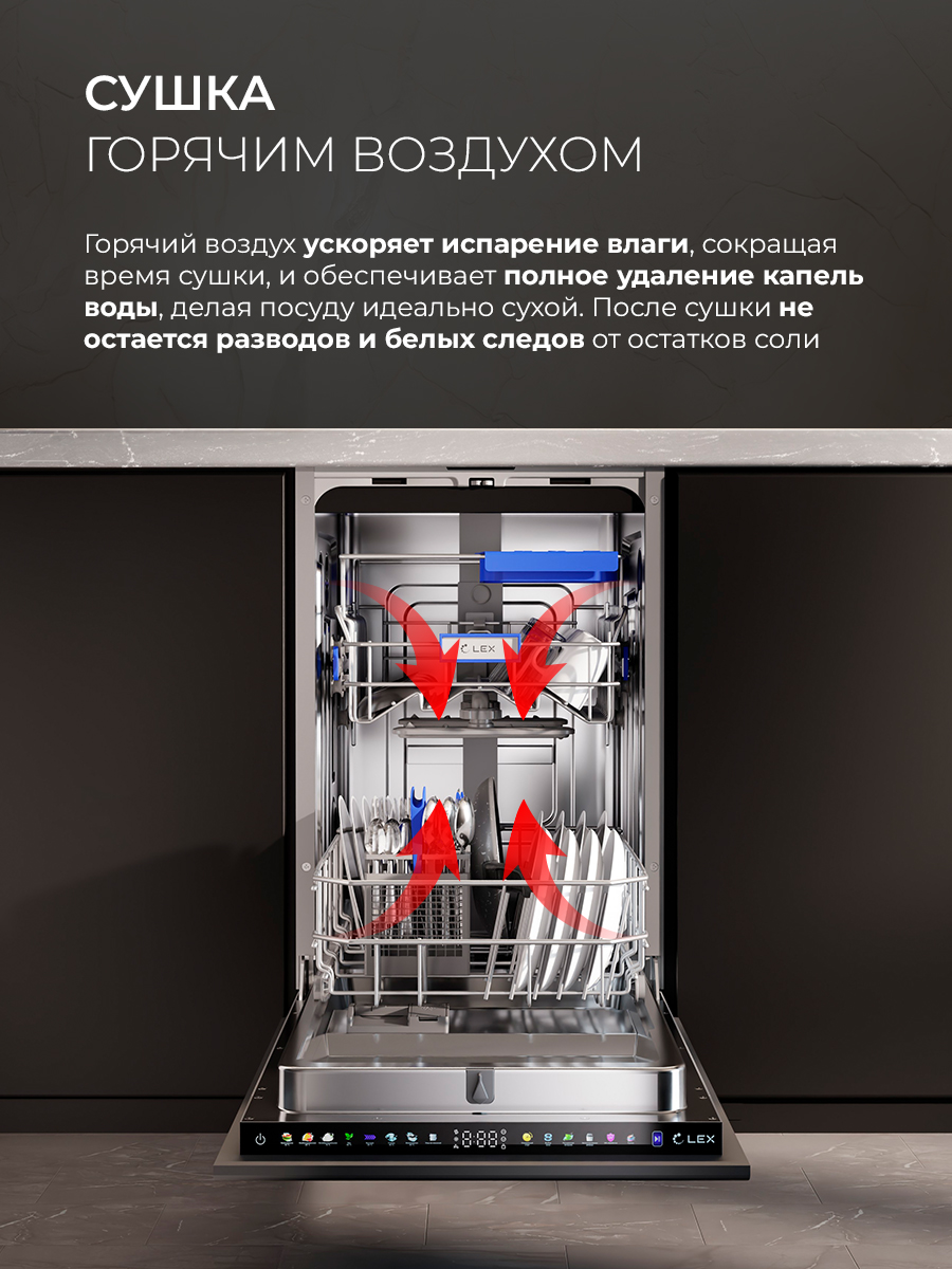 Восемь программ, включая быстрый и режим для стекла, позволяют добиться идеальной чистоты даже для деликатных бокалов. Сушка горячим воздухом ускоряем испарение влаги, сокращая время сушки и обеспечивает полное удаление капель воды, делая посуду идеально сухой. После сушки не остается разводов и белых следов от остатков соли.