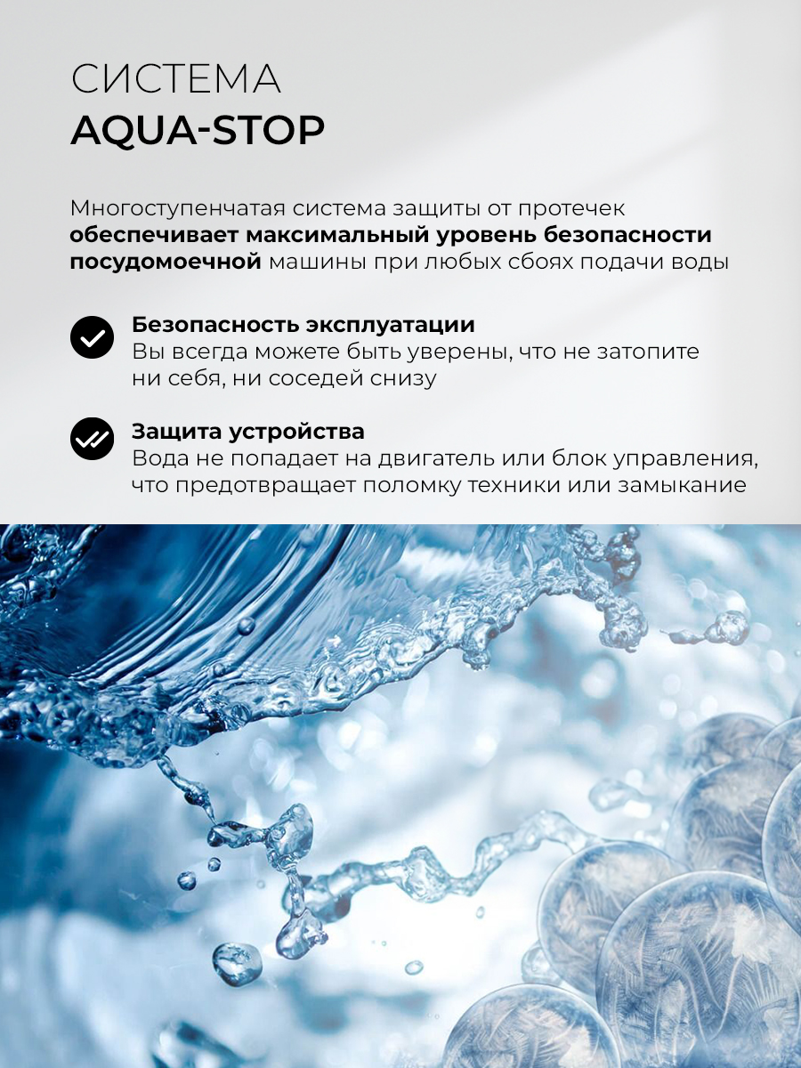 Многоступенчатая система защиты от протечек Aqua-Stop — обеспечивает максимальный уровень безопасности посудомоечной машины при любых сбоях подачи воды. А обработка ультрафиолетом в конце цикла уничтожает известные вирусы и бактерии на 99%.
