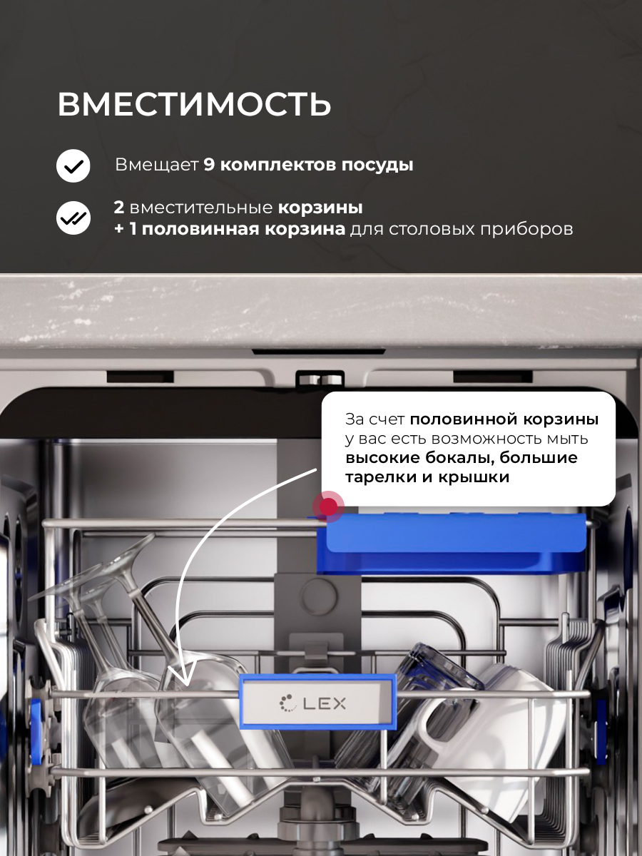 LEX PM 4583А color Lux — это идеальное решение для тех, кто ценит функциональность, удобство и безопасность. Две вместительные корзины и одна половинная корзина для столовых приборов, за счет которой у вас есть возможность мыть высокие бокалы, тарелки и крышки. Полностью сенсорная панель из закаленного стекла с цветными изображениями придает модели современный вид и повышает её надежность.