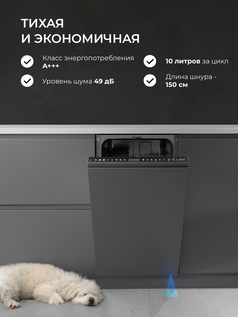 Функция отложенного старта до 24 часов позволяет запускать посудомоечную машину в любое удобное время. Технология “проекция времени в пол” обеспечивает полный контроль над процессом мойки. Автоматическое открытие дверцы в конце цикла ускоряет сушку и устраняет неприятные запахи.