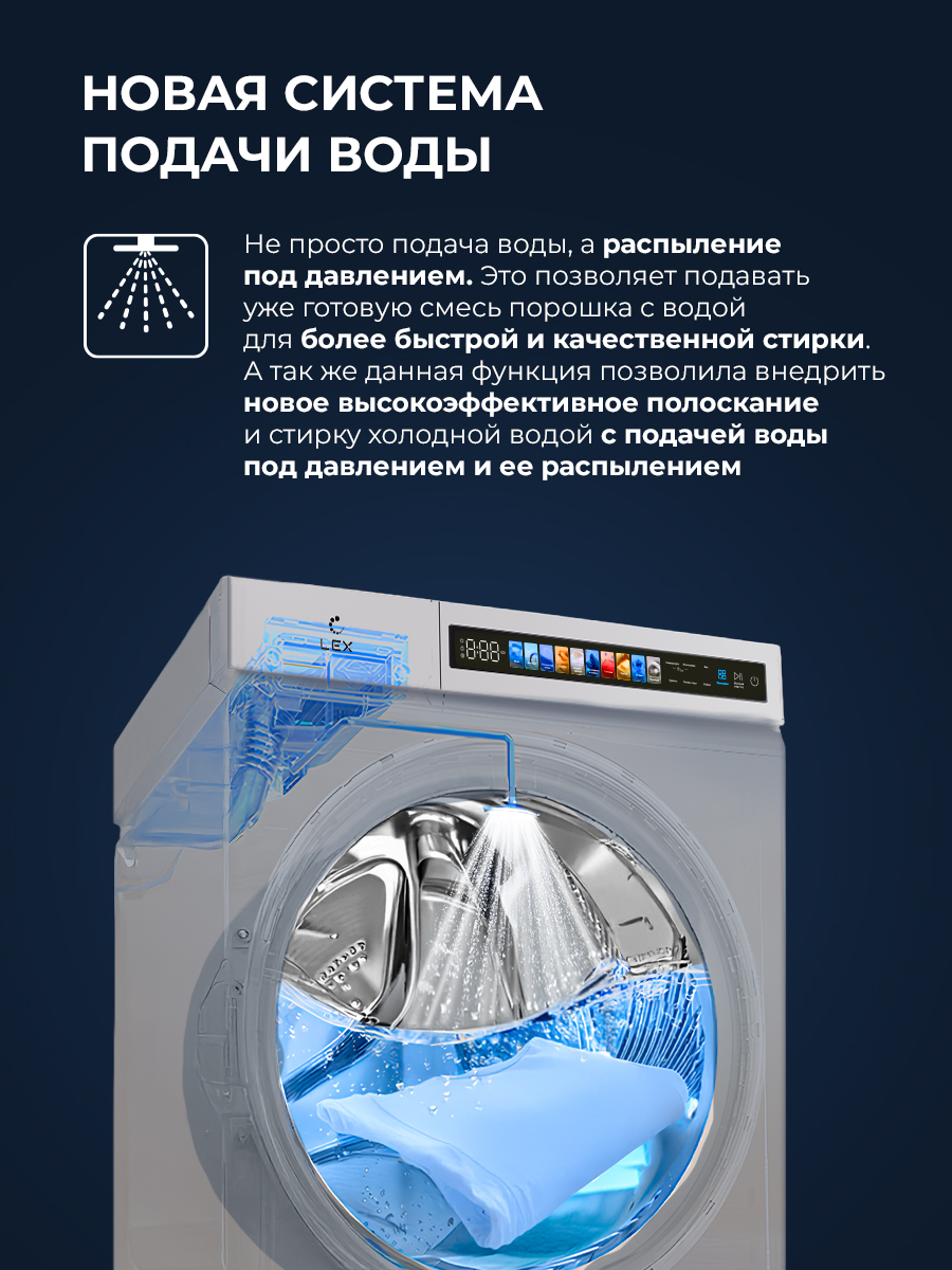 Новая система подачи воды — распыление под давлением создает готовую смесь порошка с водой, что ускоряет стирку и повышает ее качество. Дополнительно: