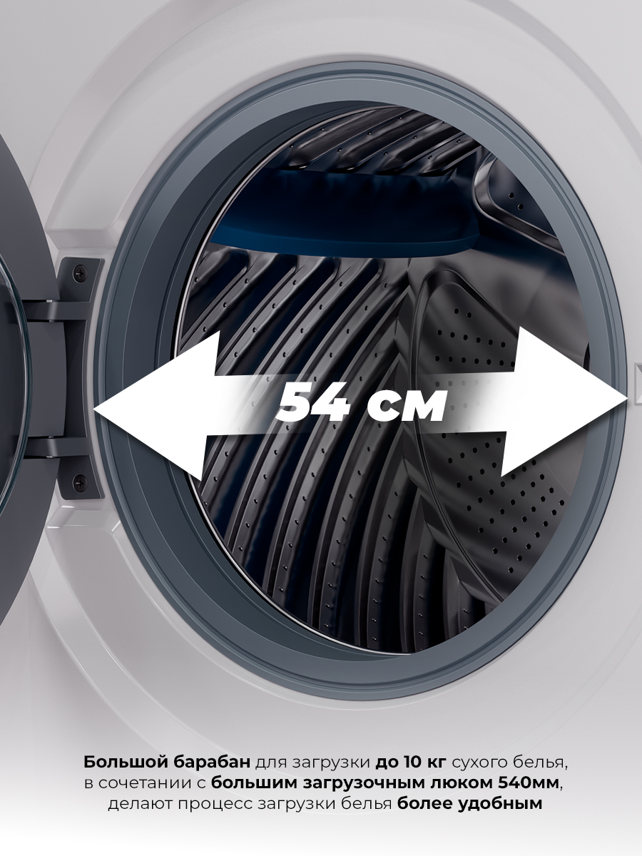 - барабан большого объёма и люк 54 см — легко загружать объемные вещи (пуховики, одеяла).