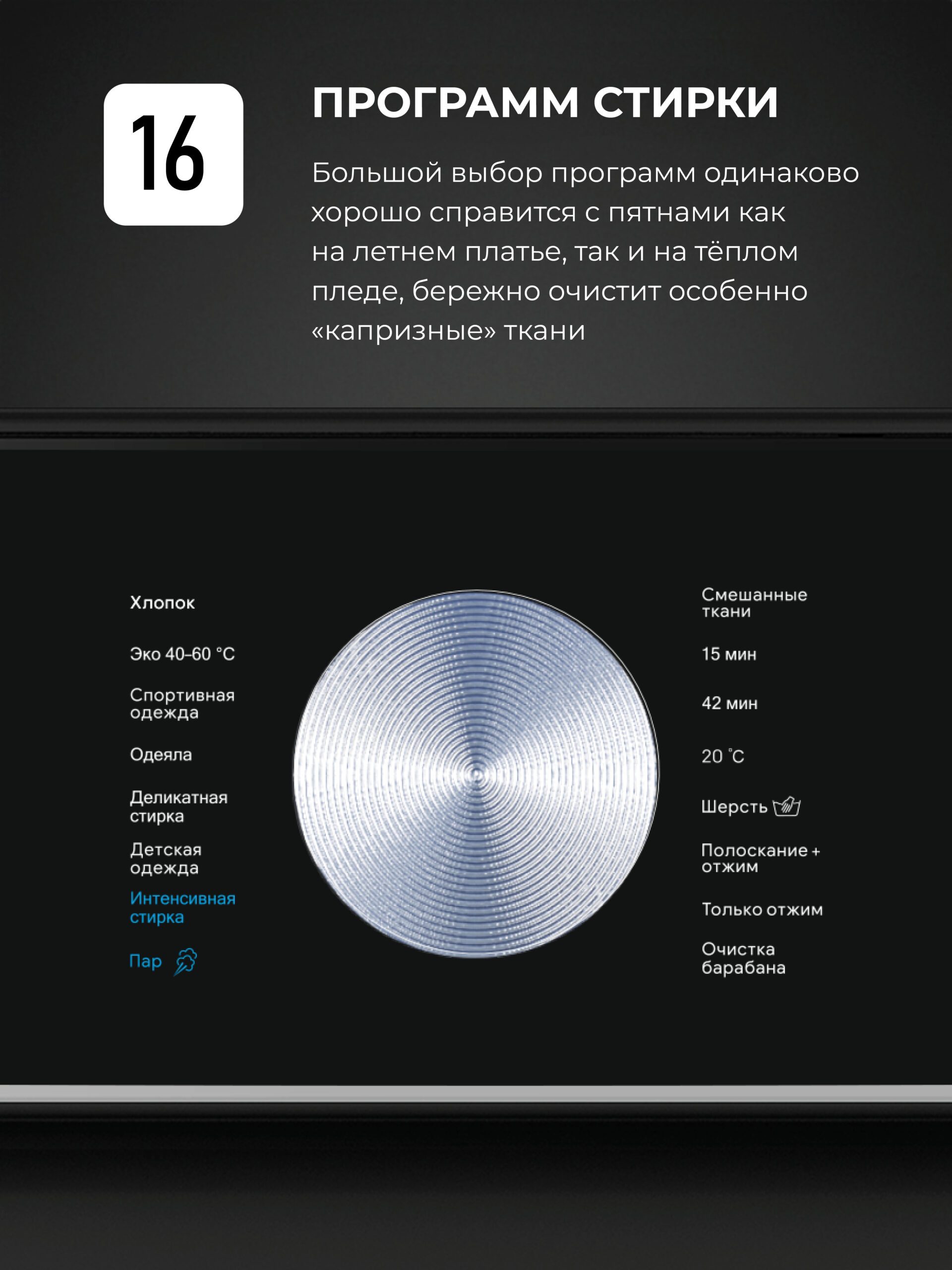 - 16 автоматических программ справятся с любыми загрязнениями на любом типе ткани и виде одежды.