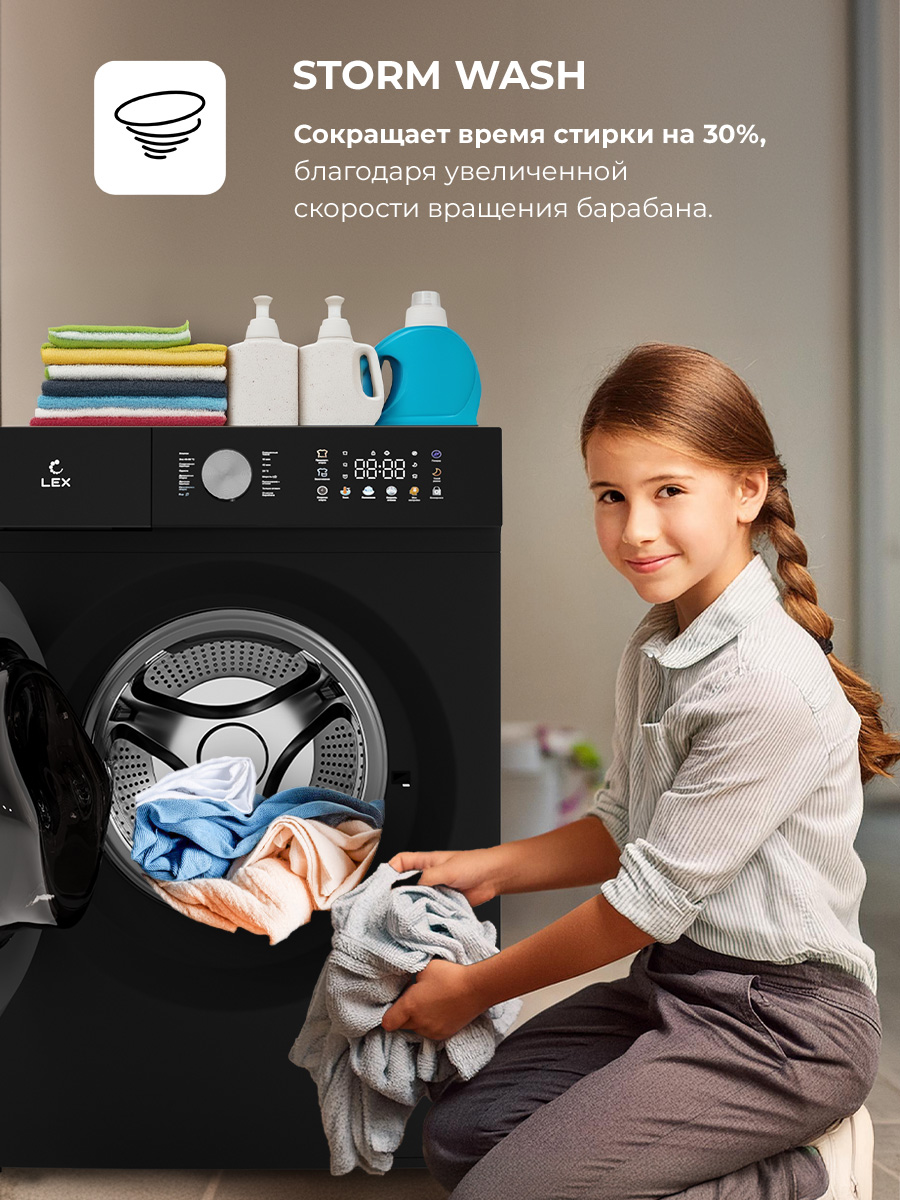- Storm Wash: ускоряет процесс стирки за счет более интенсивного, но плавного увеличения оборотов. Качественная стирка за 15 минут — это реально!