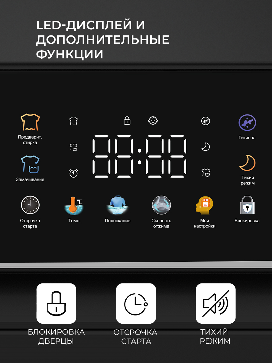 Дополнительные функции позволят вам самостоятельно выбрать оптимальные параметры стирки (дополнительное полоскание, регулировка температуры и оборотов отжима, предварительная стирка или замачивание, отсрочка старта).
