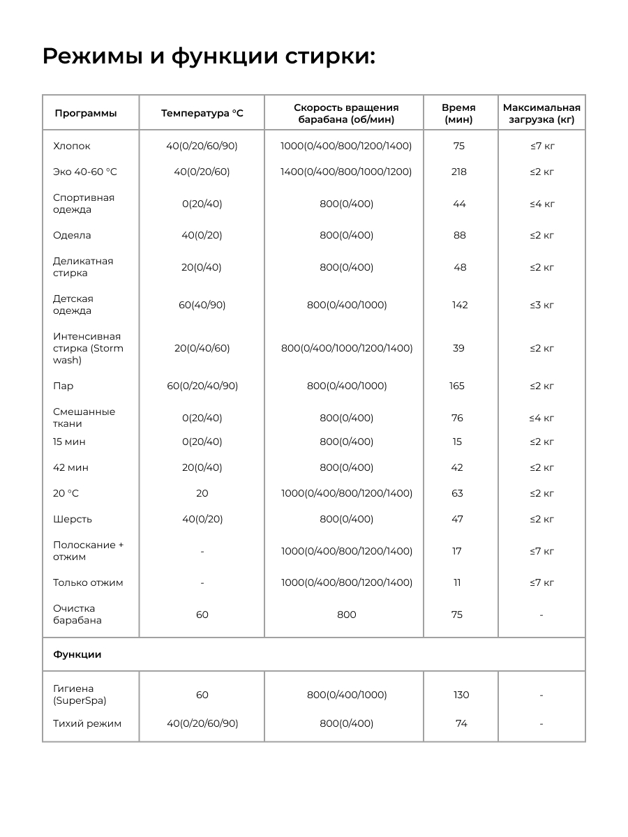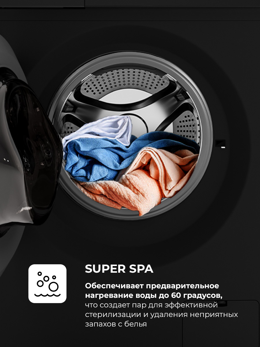 Интеллектуальная система автоматически определит вес белья и установит оптимальное время стирки. - Super Spa: программа предварительной стирки с нагревом воды до 60 градусов, обеспечивающая стерилизацию и дезодорацию белья в течение 30 минут.