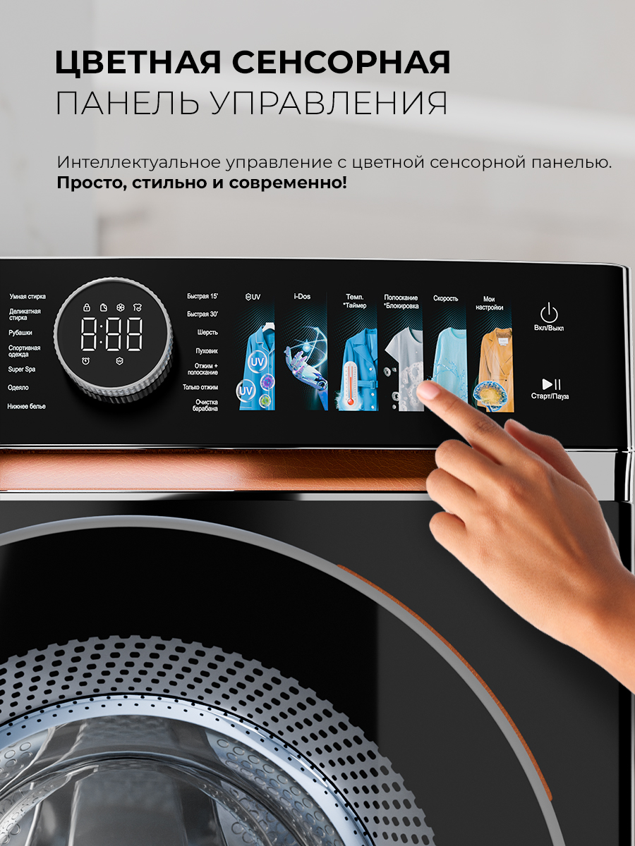 - Цветная сенсорная панель управления: облегчает взаимодействие и придает машине современный вид.