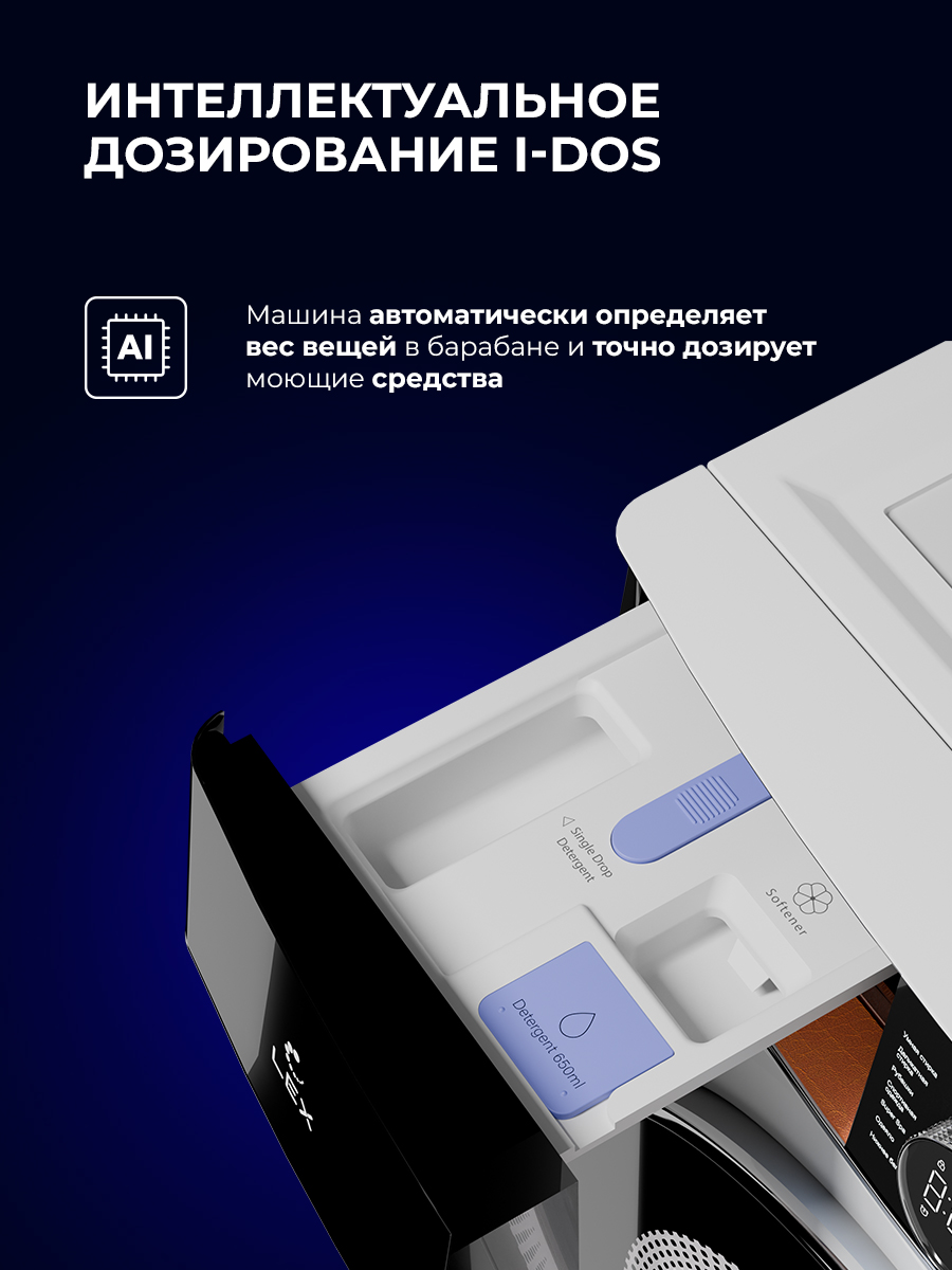 - Интеллектуальное дозирование I-DOS: машина автоматически определяет вес вещей в барабане и точно дозирует моющие средства.
